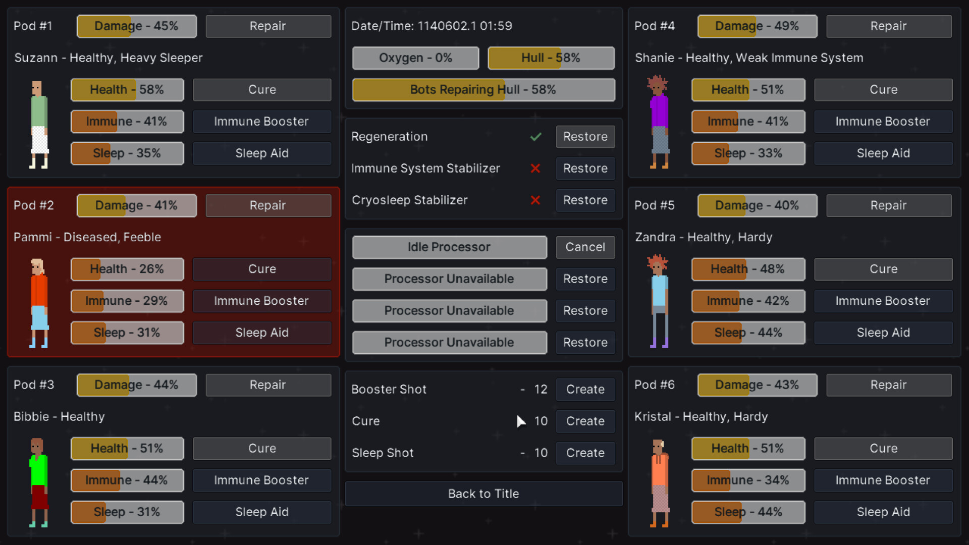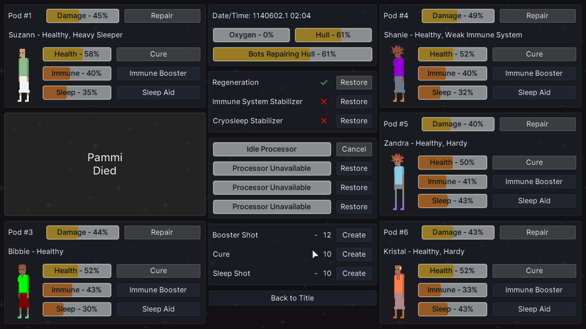 A sci-fi simulation game in which you take the role of the Emergency Pod Management Bot (EPMB) on a spaceship. The inhabitants of the medbay pods have been put into cryosleep due to the length of the journey. Somewhere along the way, disaster strikes, ripping apart the hull and disabling most of the automated systems. It is your job to keep the patients alive, healthy, and asleep.