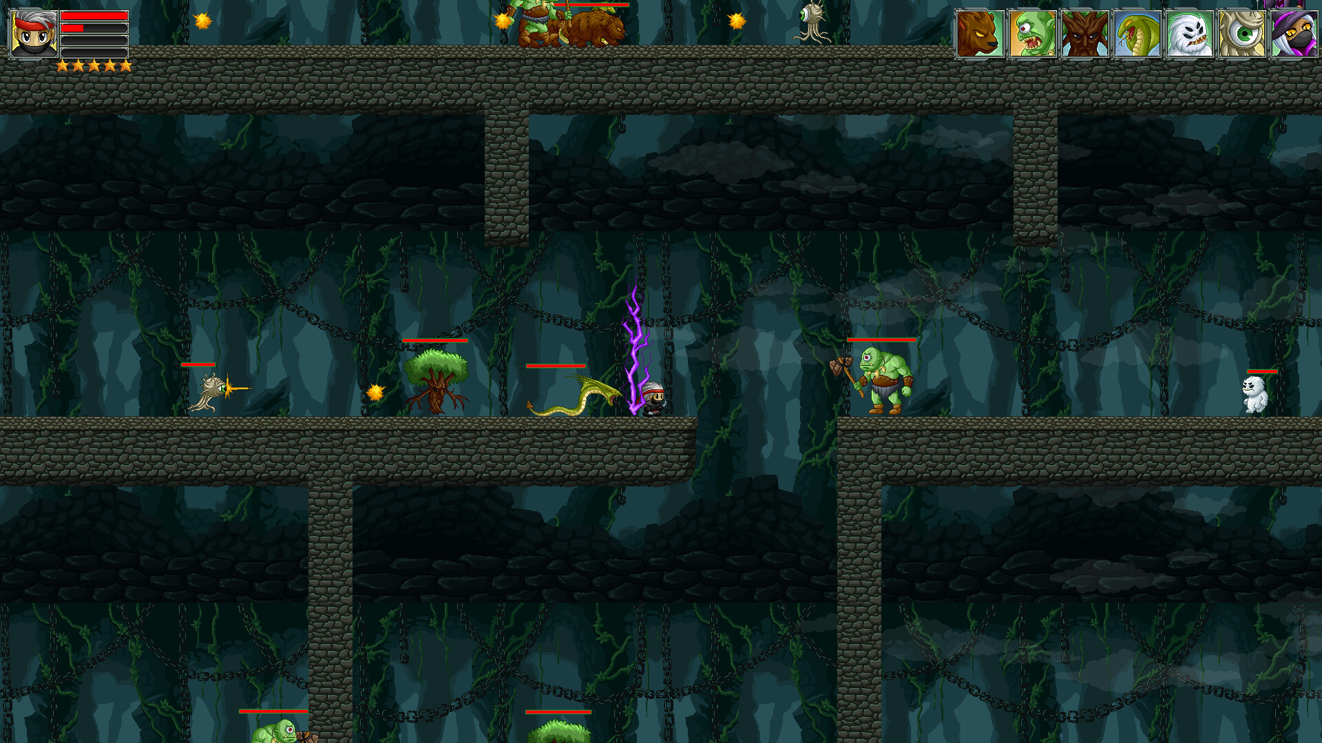 В игре представлено более 20 типов монстров, три из которых вызывают маленьких монстров в полукровном состоянии. Если бы у босса была секунда, он бы не вызвал. Три персонажа 8 уровней. После очистки всех монстров на текущем уровне будет предложено перейти на следующий уровень.