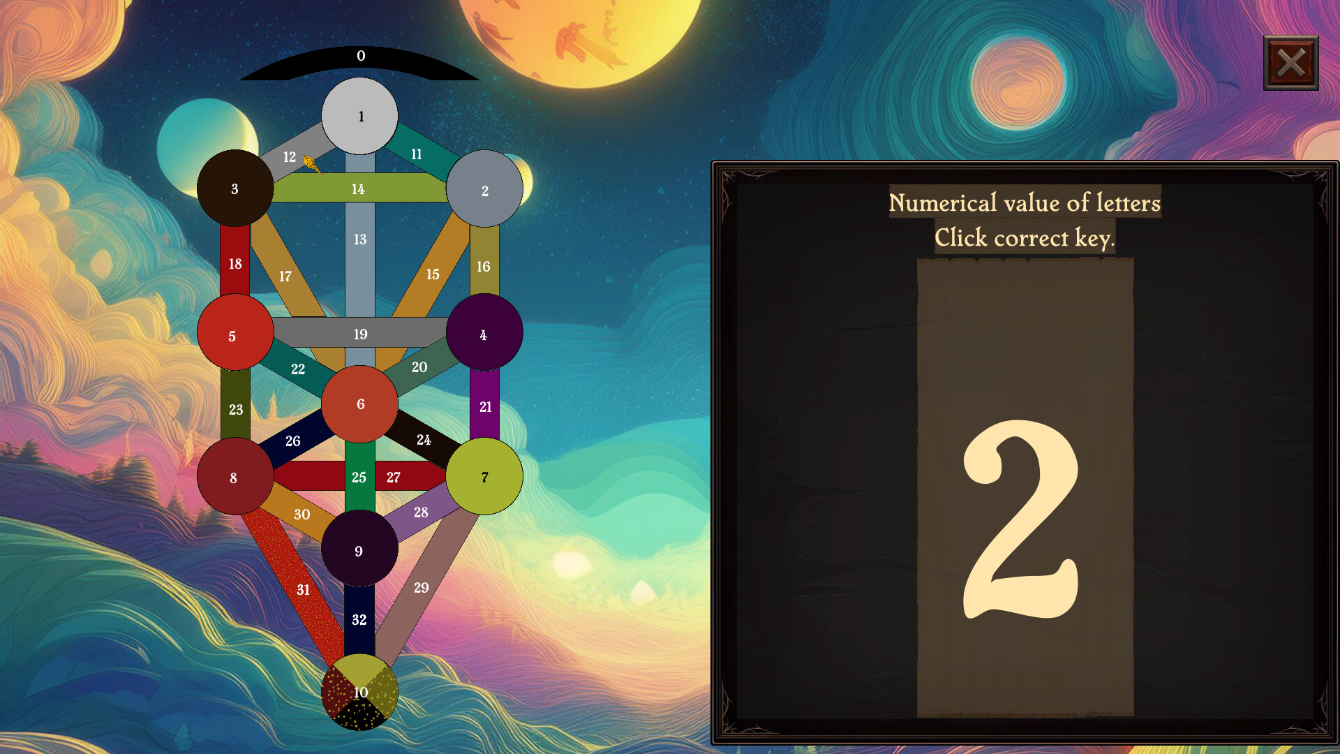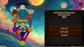 This 2D, UI based game contains over 50 skills, which you can master. Each skill represents column from Liber 777 - dictionary of esoteric symbols. Skills are designed in tree-like structure, which need to be conquered level by level. After certain skill groups, player needs to pass test to continue.