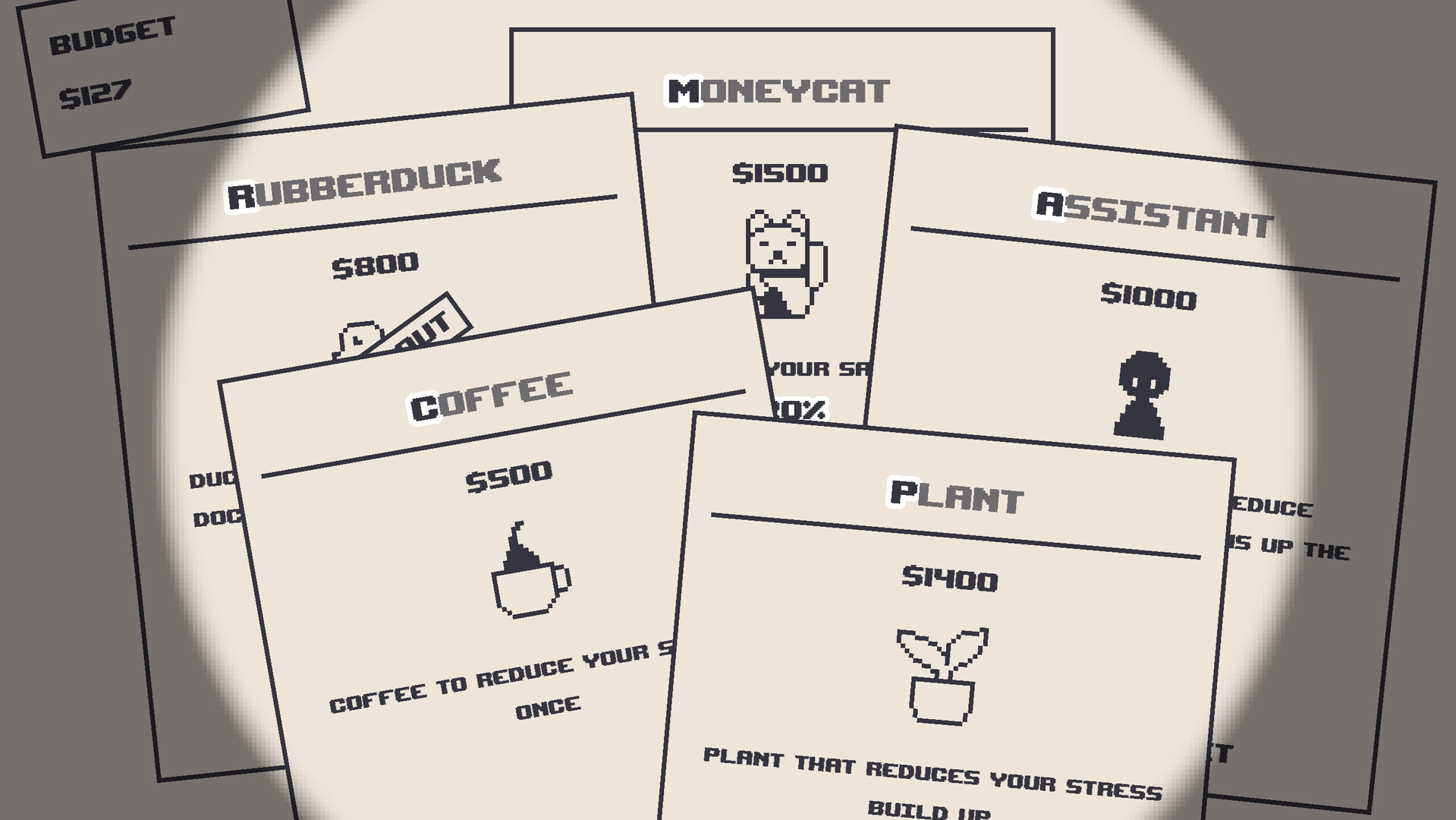 Buy a variety of items from the shop to help you at work. A plant to reduce your stress build-up or an assistant to reduce your distractions.