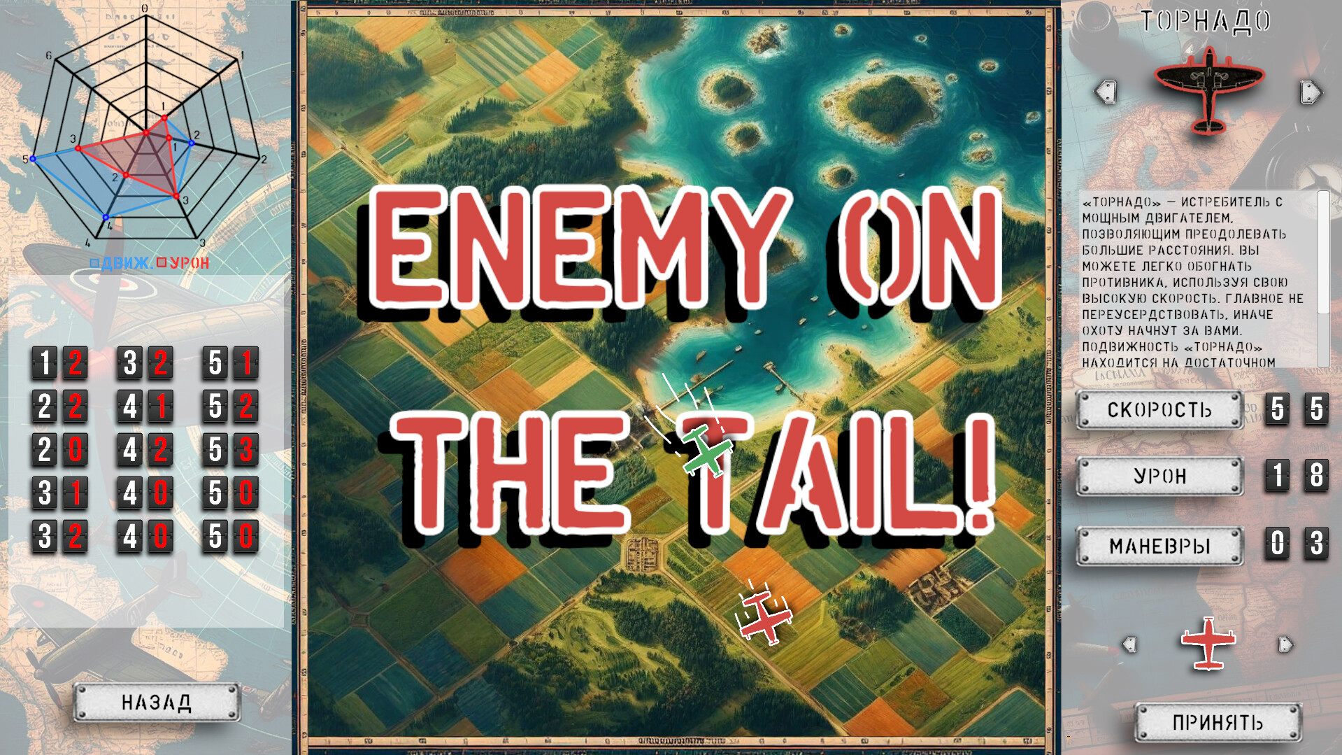 Enemy on the tail! — это пошаговая тактическая дуэльная игра о воздушных боях. Выбирай свой самолет, используй его уникальные особенности, предугадай ходы противника и атакуй! Или оторвись от врага с помощью тактических маневров! Тренируйся против ИИ и соревнуйся с друзьями онлайн. Готовы к взлету?