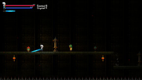 The game is a 2D platformer with puzzle elements. You need to destroy enemies on the location and complete the tasks.