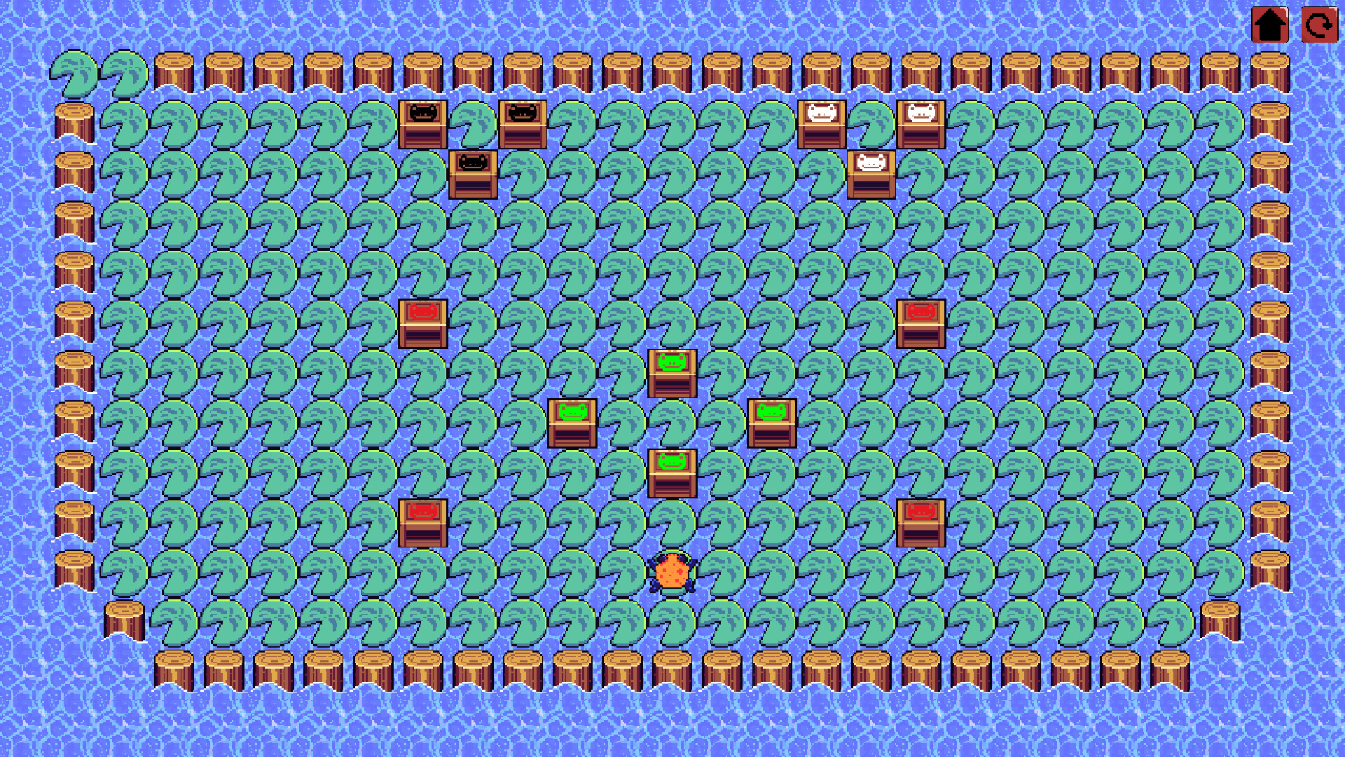 In "Frog Box," help a frog push boxes to form lines of three or more matching ones to clear the board. Explore challenging levels with natural obstacles like logs and streams that affect the movement of the boxes.