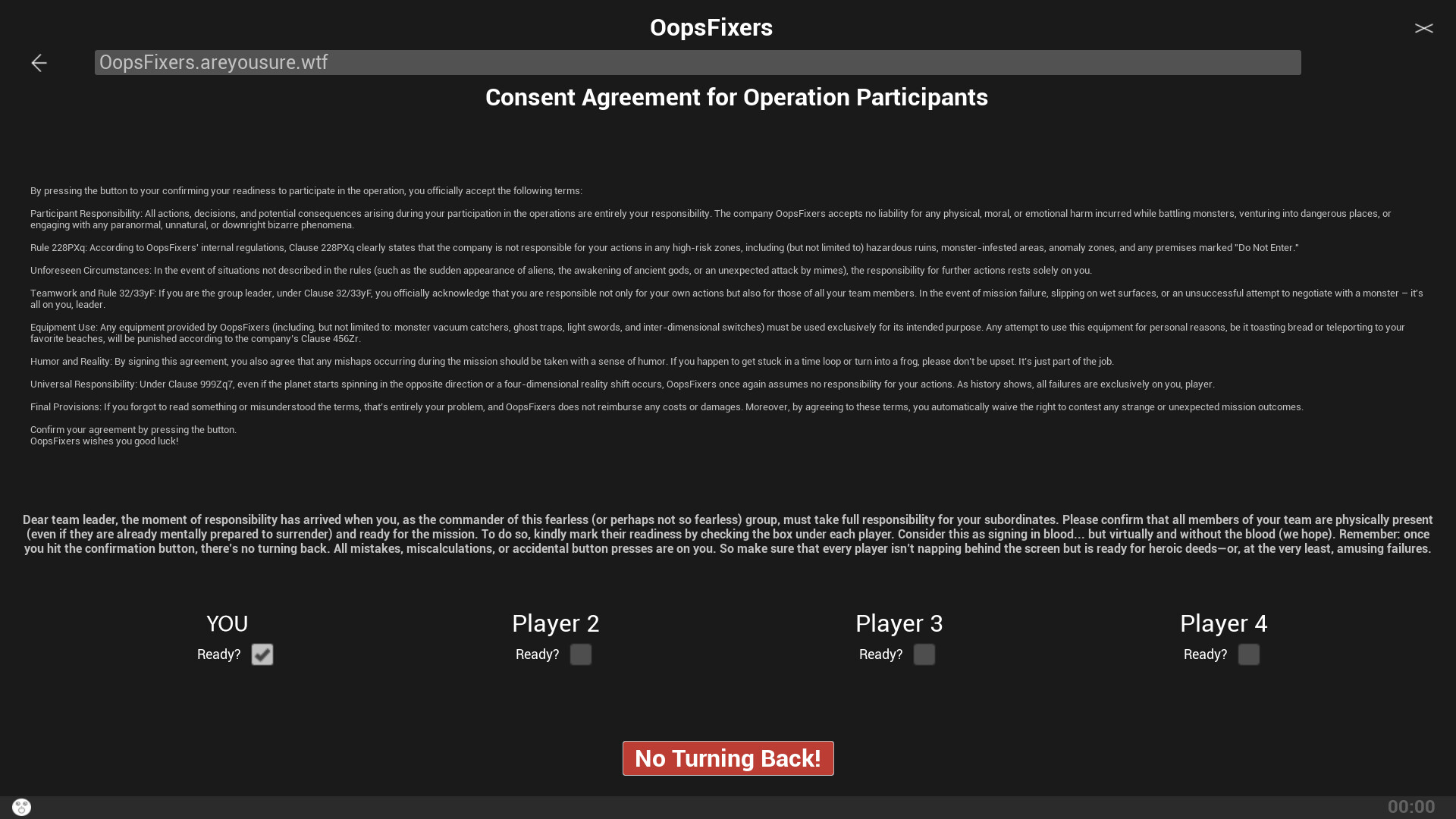 OopsFixers Company — это кооперативная игра для 4-х игроков, которая приглашает вас стать частью самой смелой компании в мире. Мы беремся за задачи, от которых отказываются другие: аномалии, опасные ситуации и испытания, которые кажутся невозможными. Компания верит в вас, и вместе мы сможем преодолеть любые препятствия!