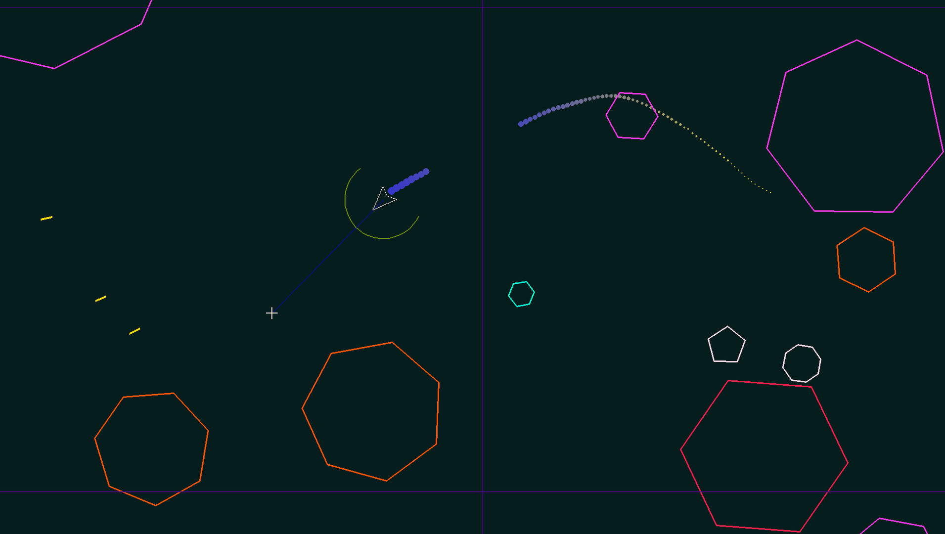 You start off in a quite empty two dimensional plane of space, you can move around any direction your facing. Then suddenly you are quite likely to encounter some polygon asteroids, make sure to not bump into these.