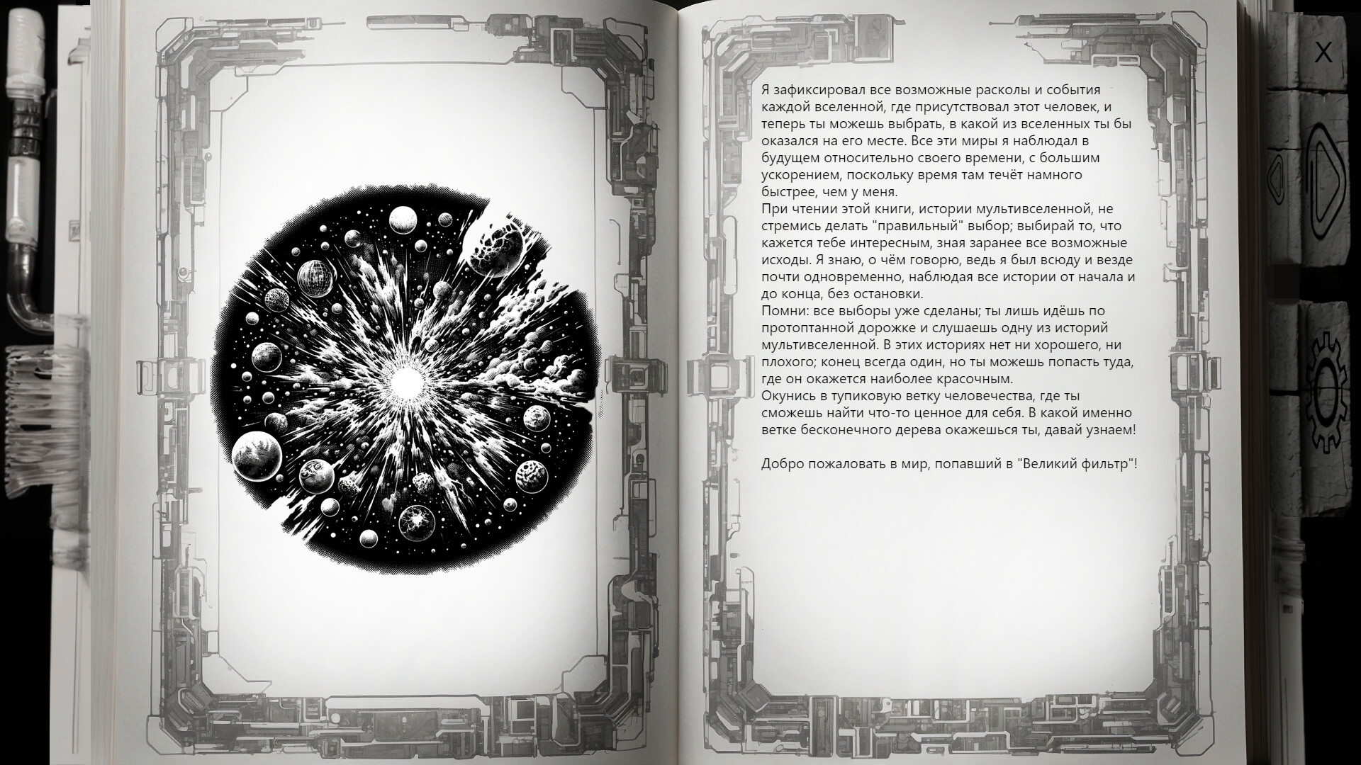 Только что прошёл игру на платину, закончив последнюю концовку. Безусловно - игра хороша. Или не игра. Книга. Суть не в этом. Интересный сюжет, прекрасные иллюстрации, жаль автор не указал сам он рисовал всё это, или пользовался услугами дизайнера, или нейросетей, потому что единая стилистика, и подача - прекрасны. Книга читается легко, быстро, вдохновляюще. Очень быстро проходишь её в 1й раз, потом - во 2й, чтобы увидеть альтернативные концовки. Но на платину пройти - нужно иметь стальные нервы. Три дня я её мучал, чтобы тыкомыкать в разные варианты, и получать различные концовки. К сожалению, не продуман тот факт, чтобы делать сохранки, это ускорило бы процесс получения ачивок, и оставило бы приятное "послевкусие" от игры. Либо же - была бы перемотка к ключевым событиям. Что, безусловно, также упростило бы игровой процесс. В целом - автору респект, судя по всему, это был его 1й проект, и он крайне удачный. Если будет продолжение данной литературы, можно будет узнать, допустим, о судьбе Директора до Марса, или корпорации, или еще чего-нить, с радостью куплю, пройду, и буду счастлив. Но вместе с тем, есть и огромная просьба - чтобы игра не "душила", будьте добры - сделайте сохранки, или перемотку. Пока потыкал все концовки, пальцы стёр. Пошёл за новыми.