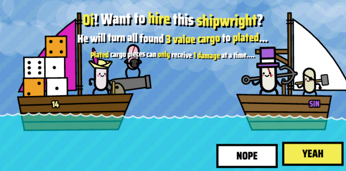 Your ship's cargo consists of dice, and their total pip values represent your ship's total HP. These dice also influence the number of damage dice you roll in combat. Be careful not to let your cargo's total value reach the dreaded number, as even rolling that in combat can have unfavorable consequences.