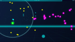 Неоновая картинка в стиле Geometry Wars – аккуратная synthwave-сетка, яркие сферы и понятный визуальный отклик при попаданиях даже тогда, когда экран забит до отказа.