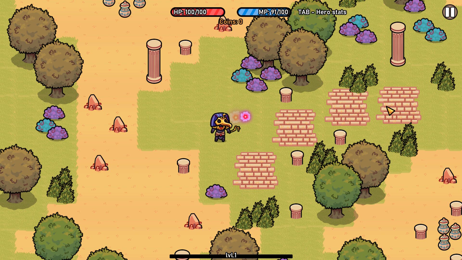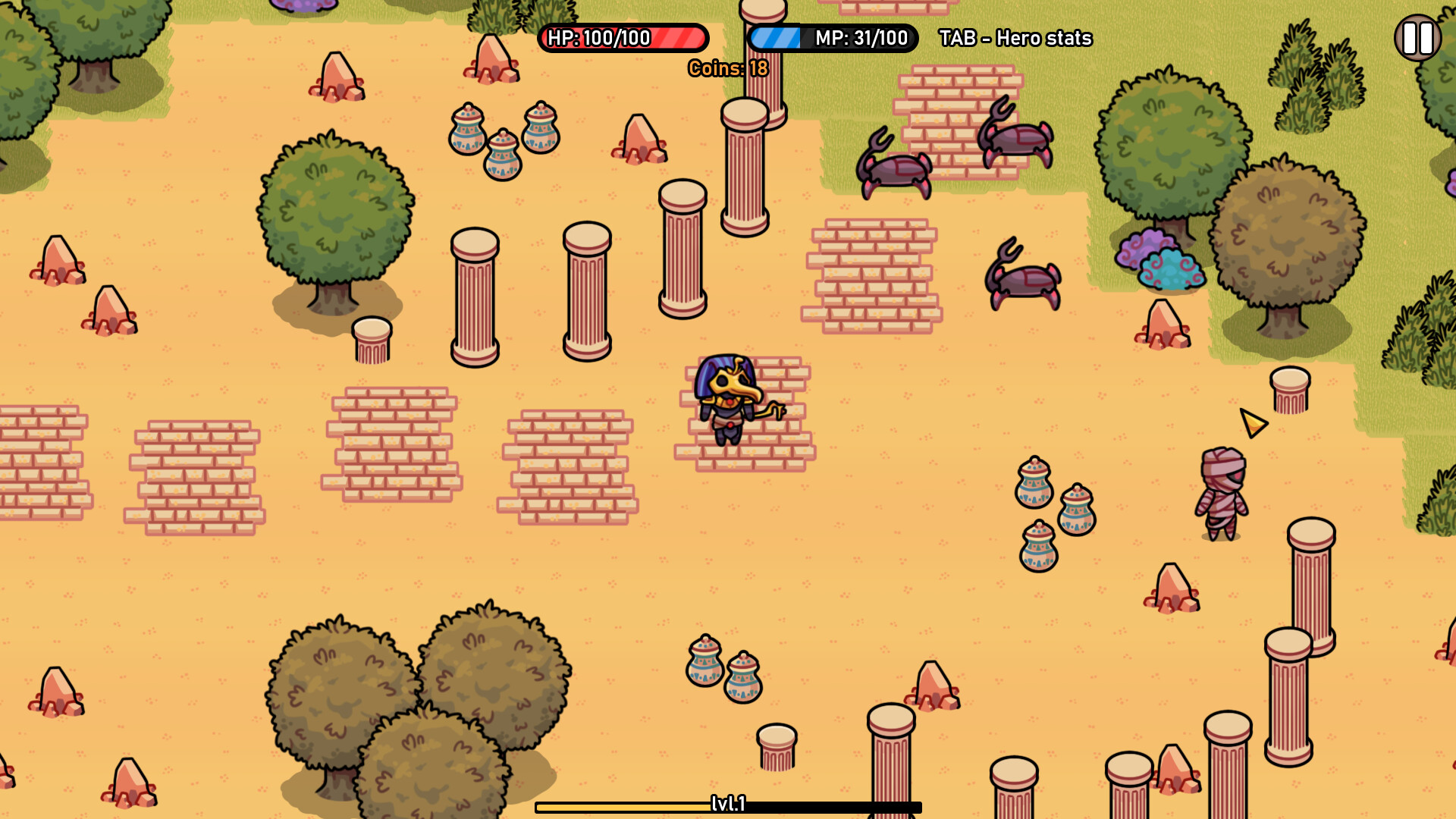 [h1] Воронтюра [/h1] [i] (ну тип в оригинале игра слов Raven и Adventure) [/i] Сужет - мы Египетский воин, облачённый в какой-то "кастет-секрет-кестюм", с таким шнобелем допустим назовём его "Ворон". Правда Пончика, Буратино и Юры с ним нету, хотя он сам как Семецкий респается... Ну да чёто я опять не в ту степь улетел, а все дороги ведут в Тайгу... Тьфу! Короче наш воин отправился на поиски волшебного артефакта, легендарного Исполнителя Желаний, не, не камня Монолита, а золотого Скарабея, который тут даже не распополамлен, как в "Аладдине", а аж четвертован бедолага. Что мы там хотим загадать - и так ясно: чтоб больше урожаи были, маяк стоял и лодки плыли. И собственно ради всего хорошего пускаемся мы в эту авантюру с маги-мечом... тьфу! С посохом каким-то вернее магией лупящим супротив всякой мерзости мифической. Геймплей: В нашем путешествии по этой всей местности нам противостоят какие-то крабы, мумии и прочая гадость, так же на местности есть горшки с финансами, которые тут называют "монетами", хотя это вроде алмазы. Из врагов тоже они выпадают. От врагов можно убежать на другую локацию, при этом они не респаются, но возвращаются в исходную точку и регенят ХП, а бегут часто несколько сразу, если их стриггерить. У нас есть посох, которым мы стреляем по врагам магией, но мана долго восстанавливается, а закончившись, с нуля восстанавливается быстро, но пока не заполнится на 100%, мы не можем стрелять вообще. Крабы нас только щиплют, а мумии на некоторой дистанции лупят своей магией, и лупят сильно. Помогает нам только какой-то пребывающий в медитации восточный мудрец, сидящий в разнымх местах , но естественно не задаром: исцеление на полную стоит 50 монет. Ещё есть так называемые очки про... пре... прампампо, короче кача навыков, дают нам возможность повысить себе максимум ХП, максимум маны и урон. Очки эти либо так - одно дают за каждый уровень прокачки, столбик коего заполняется при убийстве врагов, либо покупается у Мудреца за 200 монет. В общем, довольно динамичная, но всё равно релаксовая убегалка-отстреливалка. Тысяча мумий из 10