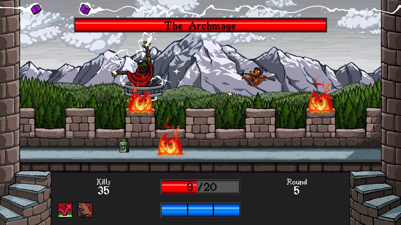 Kobold Castle is a 2D arena survival game that takes place on the wall of a besieged castle. As one of 4 kobold defenders, you must hold the line against dangerous waves of attackers, collect upgrades and powerups, and defeat a variety of enemies and bosses. Try to survive as long as you can!
