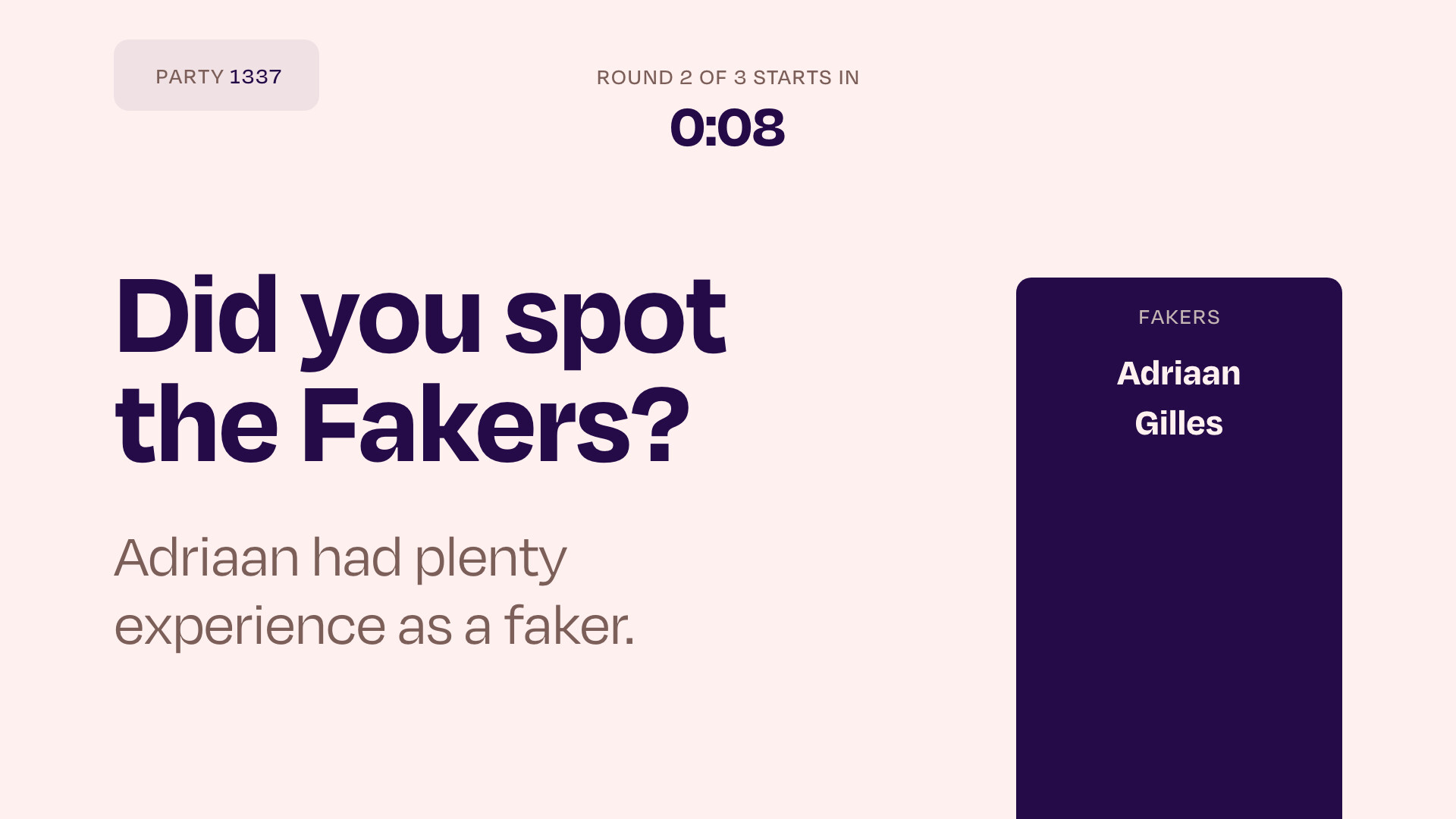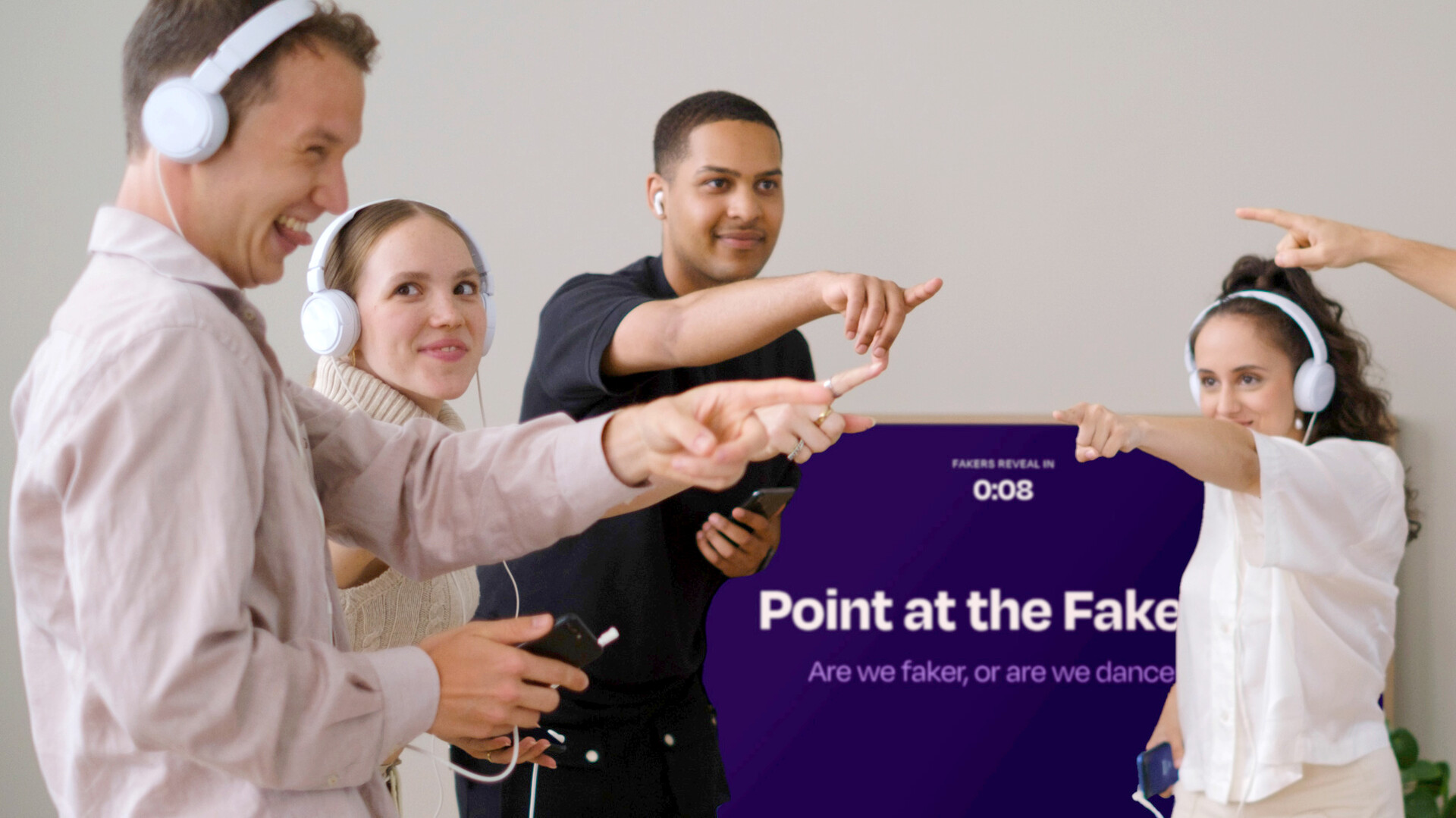 Everyone dances to the same music, except for one player; the faker. The faker doesn't hear any music but instead acts like they hear the music, trying to remain undetected. At the end of the round, everyone points at who they think the faker is... and then the faker is revealed!