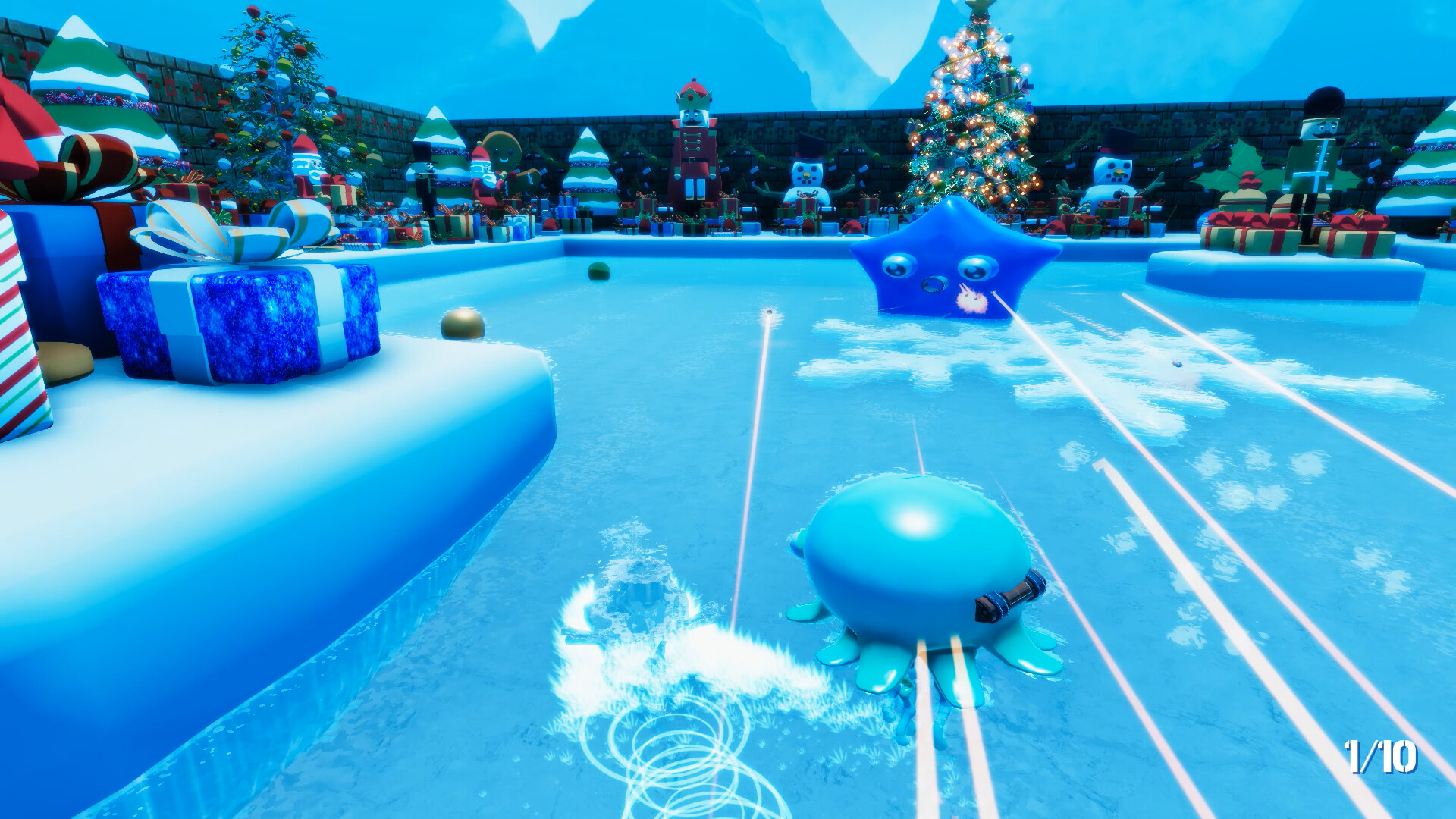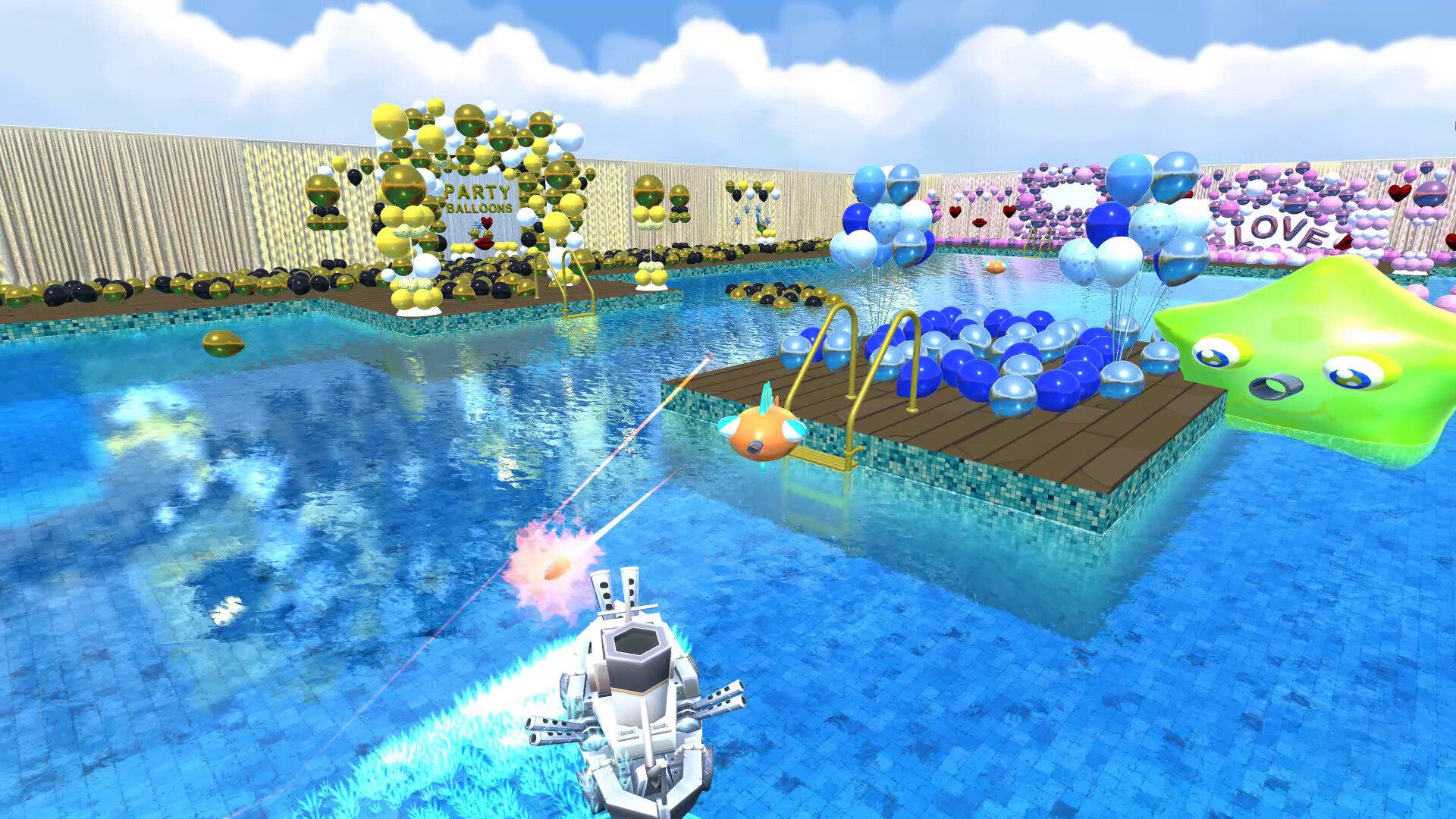 Each level begins in a different pool with different obstacles, styles, and decorations, teeming with enemies. At first glance, the enemies look somewhat funny as they are fishes with guns that apparently do not belong in your pool. Once the fishes have spotted you they start moving towards you and start shooting at you with relatively slow flying bullets. You are able to outmaneuver your enemies by simply dodging their bullets or diving beneath them. Then you can use your front or side cannons to fight back the evil fishes by shooting at them. At the end of each level waits a big toy starfish with more energy and bigger bullets. You have 3 lives before the game end, so be careful not to get hit by a bullet.
