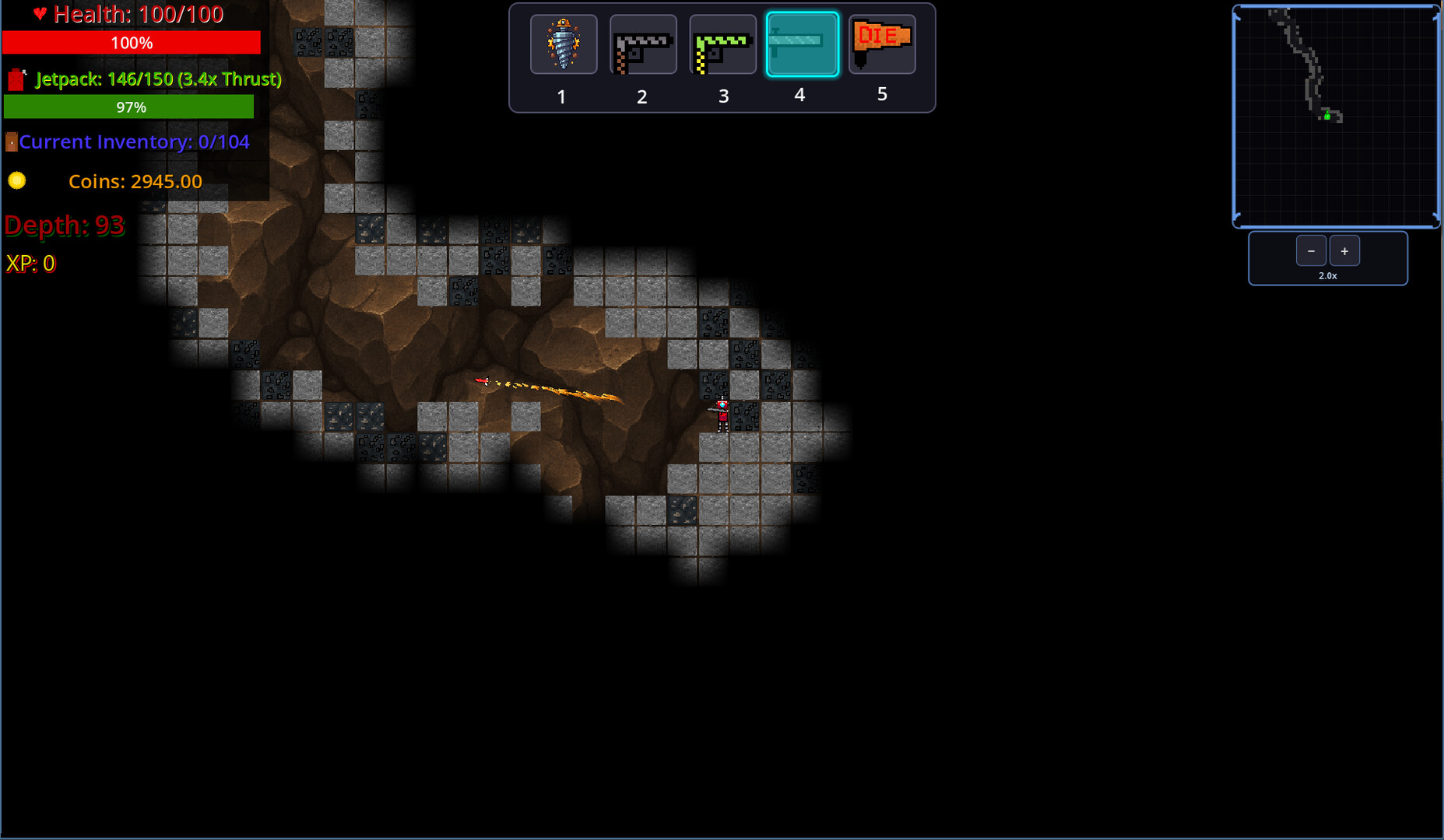 Start each run with only a drill and a weak jetpack. Mine resources, fight enemies for XP, and sell loot at the Shop for per-run upgrades (drill power, jetpack fuel, hull armor, weapons). When you die or get stuck, you earn Skill Points based on performance to invest in permanent meta-progression that makes every new run start stronger.