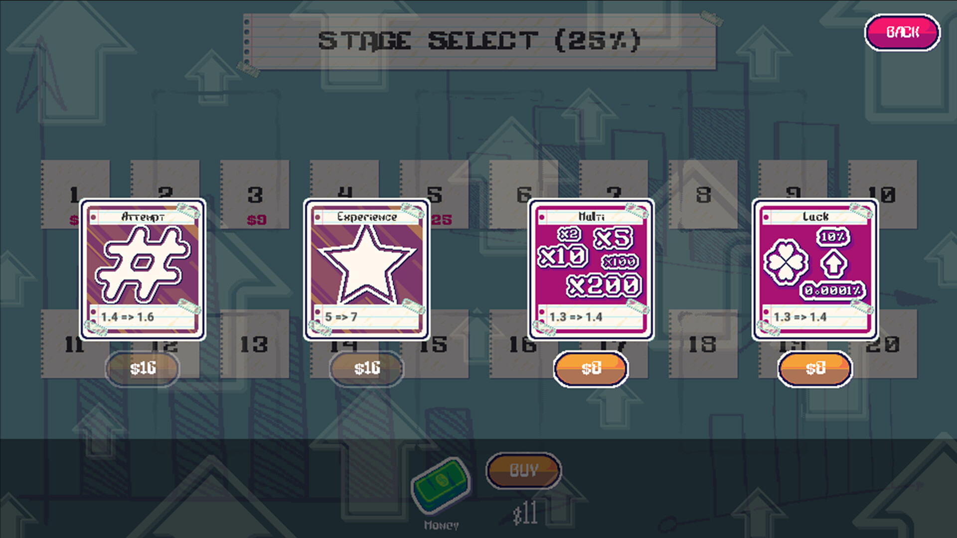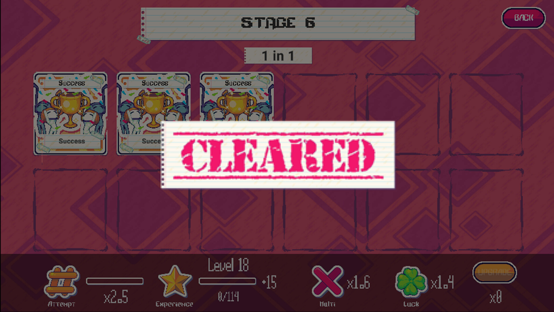 Маловероятные события включают в себя находку четырёхлистного клевера или удар молнии. По мере автоматического заполнения шкалы вы будете получать опыт, который ведёт к деньгам. За деньги можно покупать улучшения, увеличивающие ваши шансы на победу в уровне.