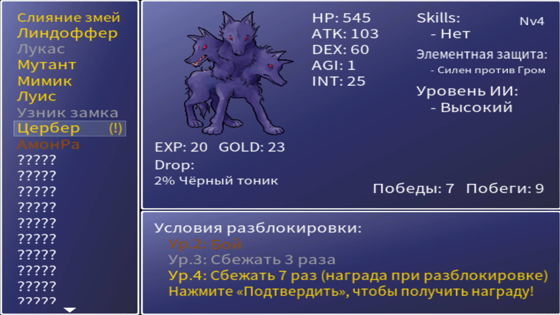 Каталогируй всех монстров игры. У каждого есть уровни — от 1 до 4. Повышай уровень, выполняя побочные задания. Чем выше уровень, тем больше информации. На уровне 4 — награда!