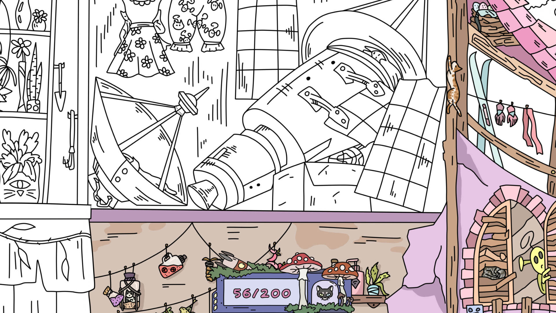 Исследуйте продолжение удивительного инопланетного пейзажа, находя милых кошек и раскрашивайте черно‑белые локации яркими космическими красками.