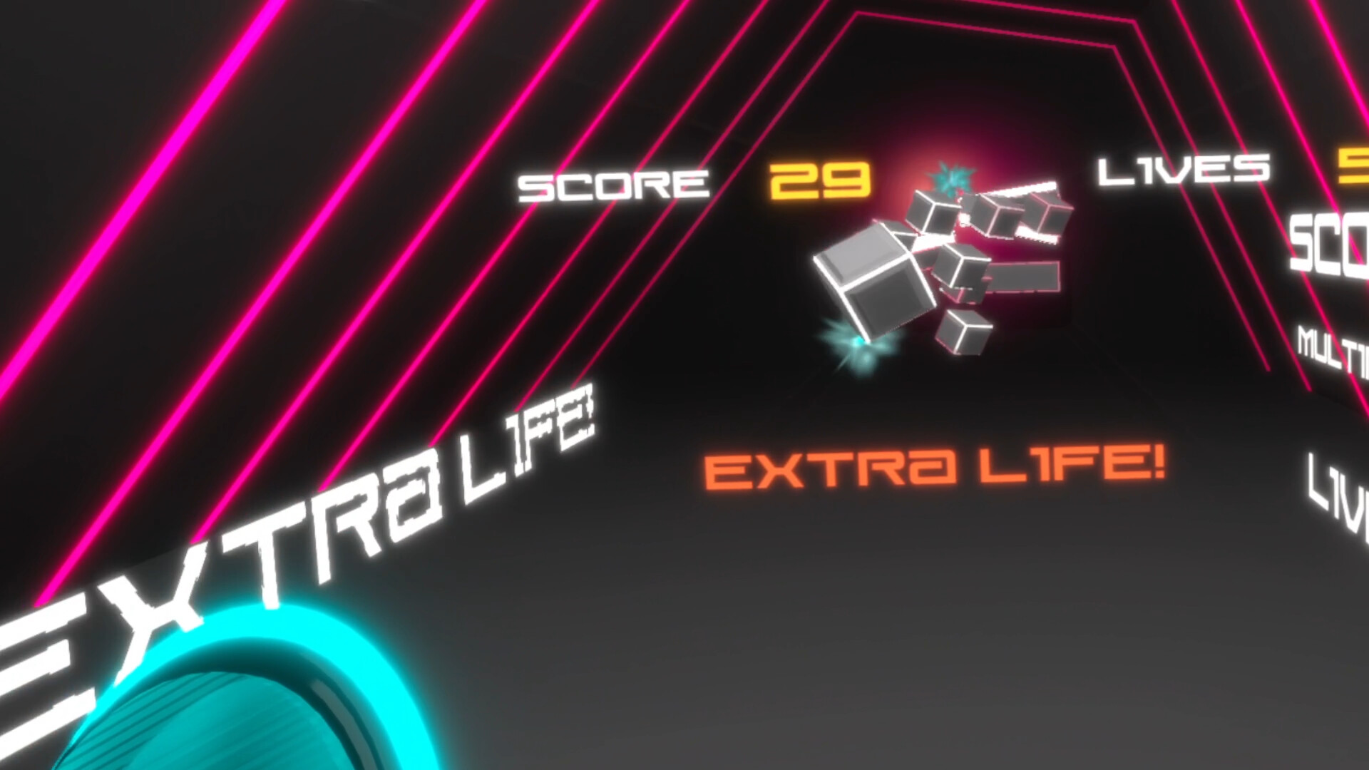 Simple mechanics make for an enjoyable game that's also skill based. It starts as a relaxing, colourful VR romp that's casual then demands higher levels of skill from the player, eventually evolving into a brick-breaker that is as challenging as it is fun. Walls slide closer to the player, multiple balls appear, explosive balls help destroy the bricks while bonuses in the form of extra lives, larger and dual paddles fly at the player.