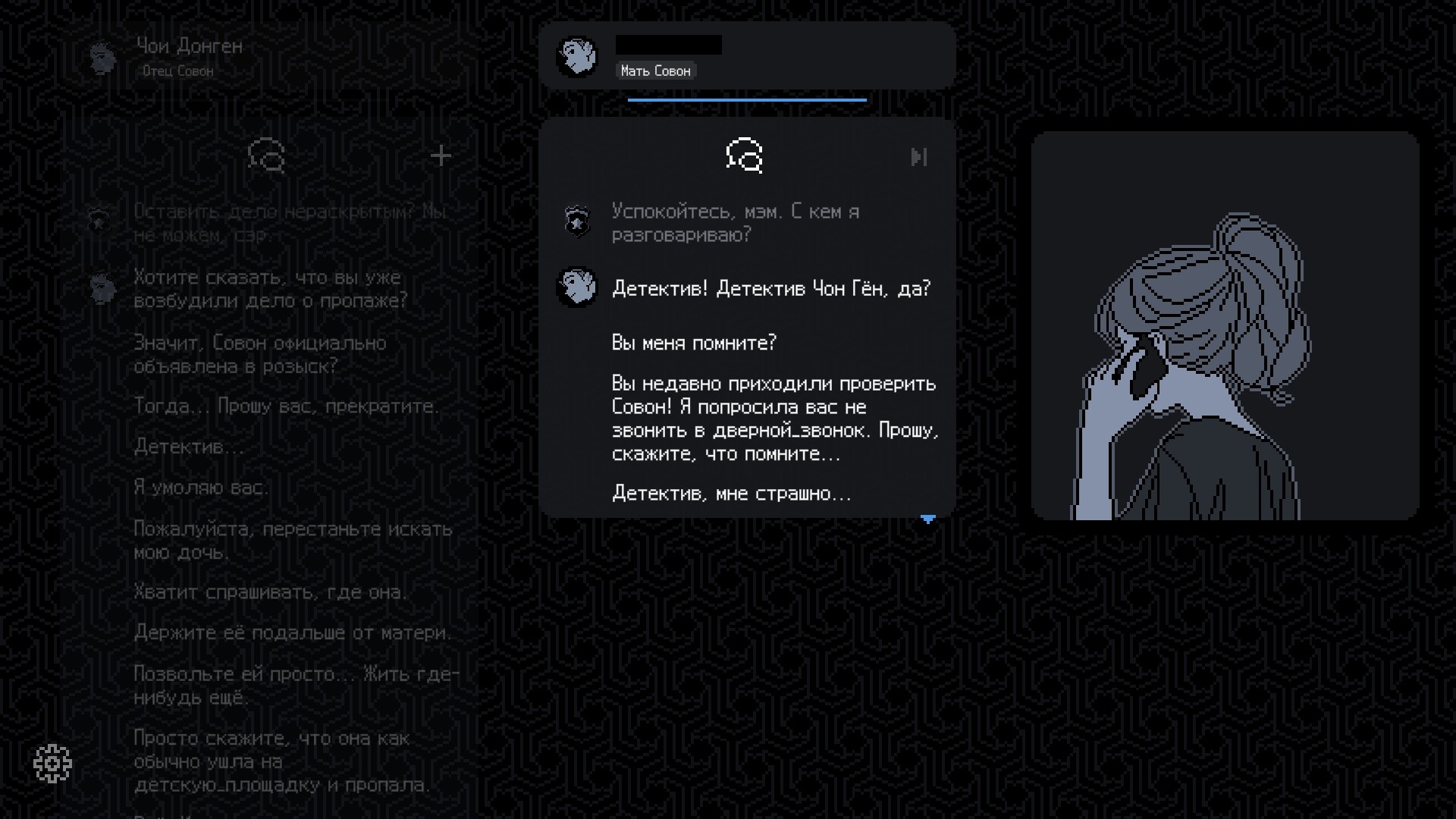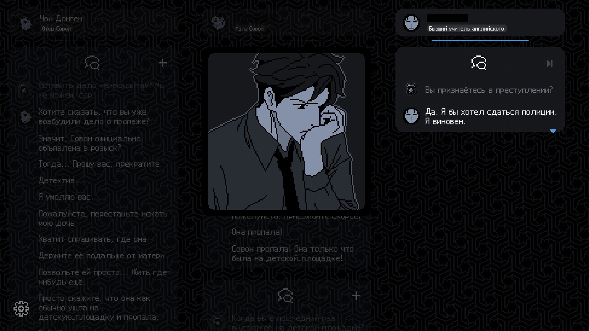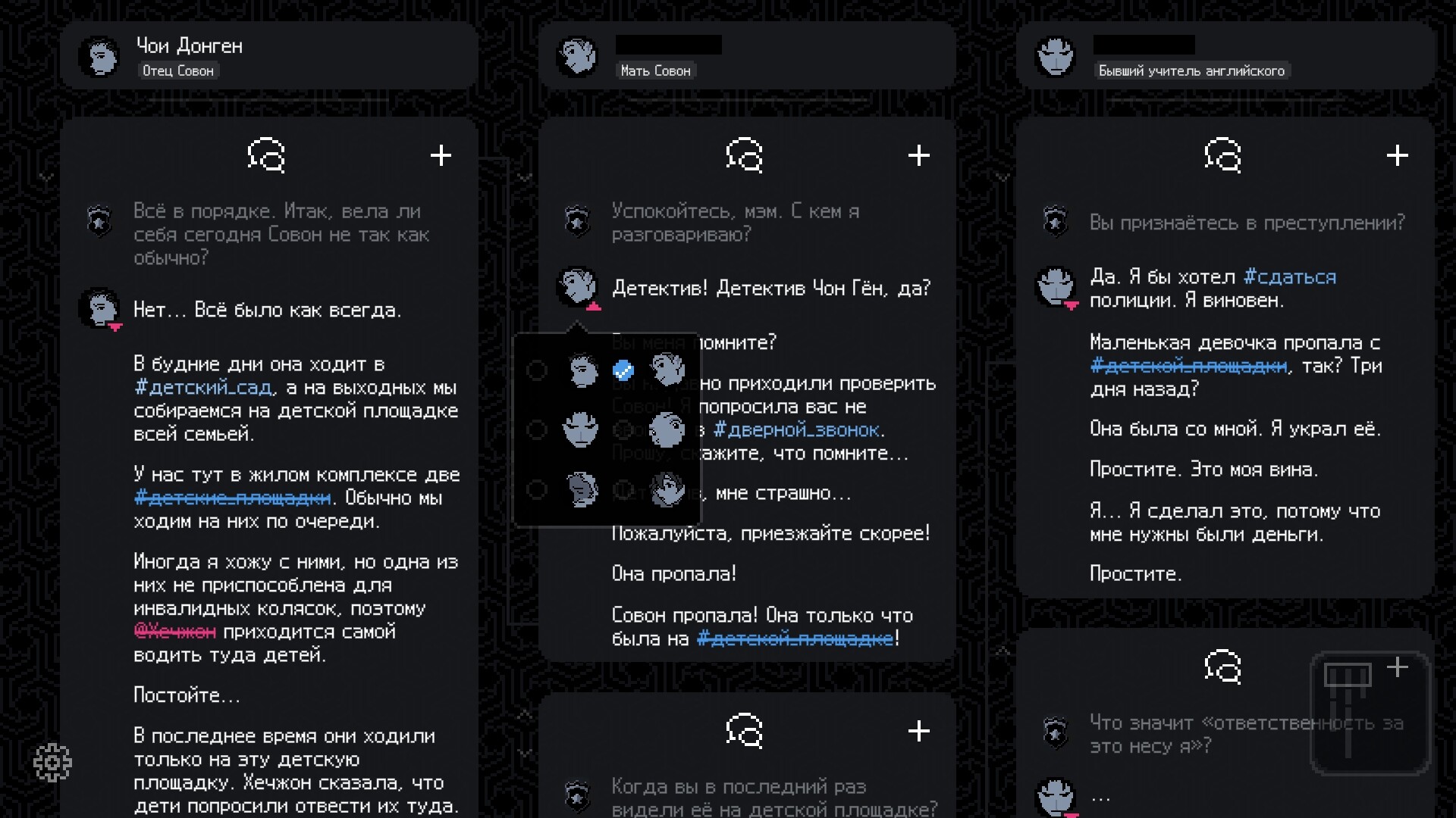 Отличный детектив на один вечерок. Концовка не оставит вас равнодушными. Корея, Сеул, 2024 год. В лечебнице проходит лечение бывшая полицейская, страдающая прогрессирующей амнезией. Её мучают обрывочные воспоминания о деле о пропавшей девочке, которое она расследовала 12 лет назад - единственное дело, которое она так и не смогла закрыть. Соответственно, так как она страдает амнезией, многие детали уплывают из её сознания: некоторые показания она не может вспомнить, у других не помнит, кто и когда их давал, не помнит некоторые даты и некоторые имена. Наша задача как игрока - помочь ей восстановить недостающие данные и выставить всё в логическом порядке. Важное замечание: играть лучше на английском языке, потому что в русском языке сразу понятно, кто говорил - мужчина или женщина, тогда как в английском языке фразы звучат обезличено: I did, а не я сделал или я сделалА, а это - важная часть геймплея. Второе важное замечание: даты в американском формате: месяц, потом день.