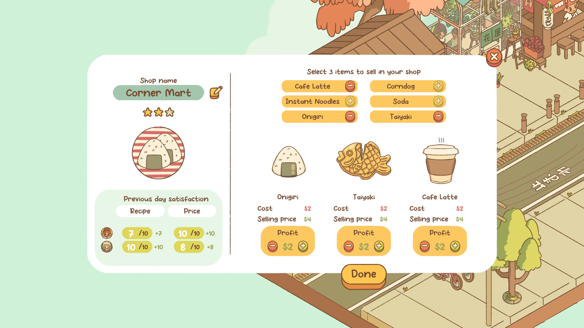 Build homes to add villagers to your street, then improve their happiness by beautifying every inch and building a variety of shops & attractions! These include ramen shops, boba cafes, bookstores and more, each with unique inventories and effects.
