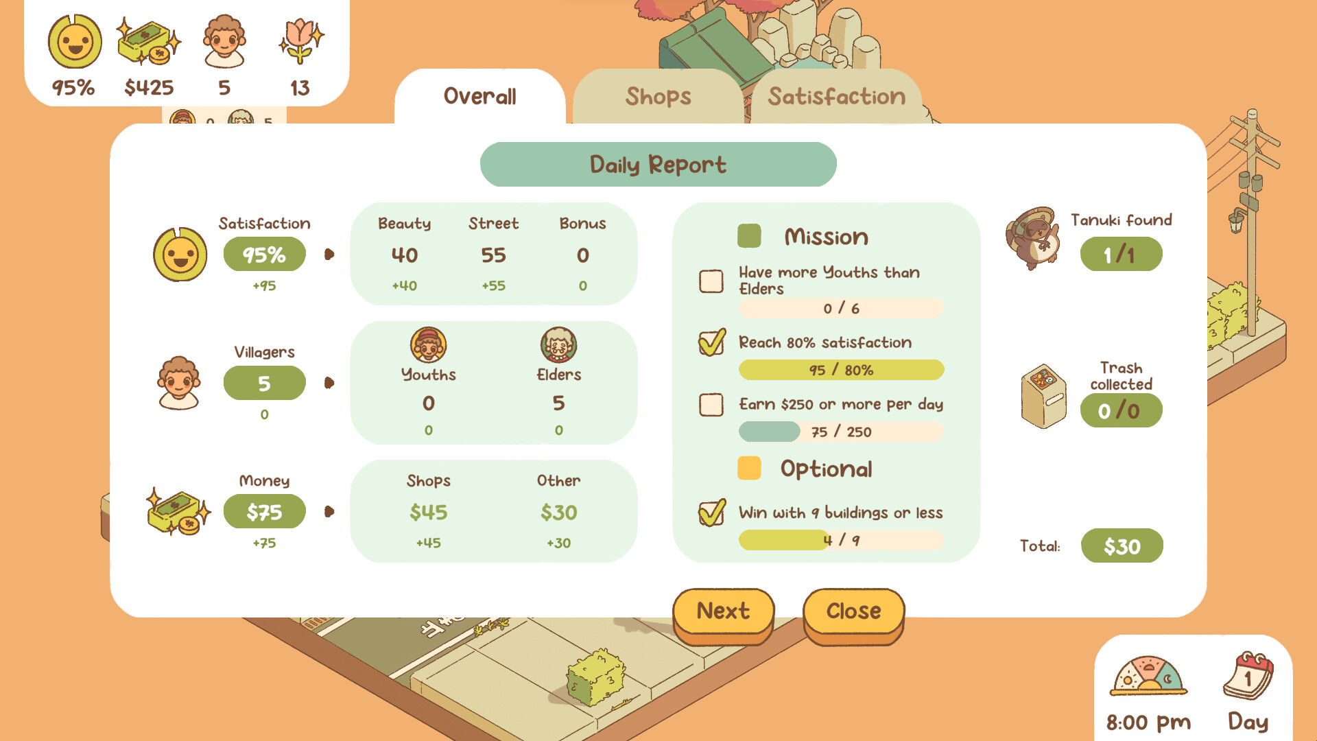 Once you start the day, you'll get to see each villager react to your street and offer helpful feedback on how to improve! Memorize their preferences and refine your street the following day.