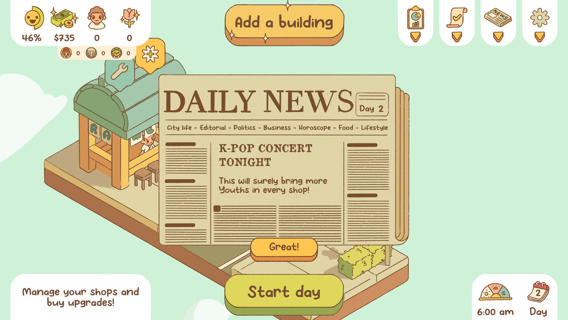 Attract customers with everything from floral bouquets to karaoke! Shops you create will need your careful guidance to offer the right products at the right prices. Lead them to success and make your neighborhood thrive.