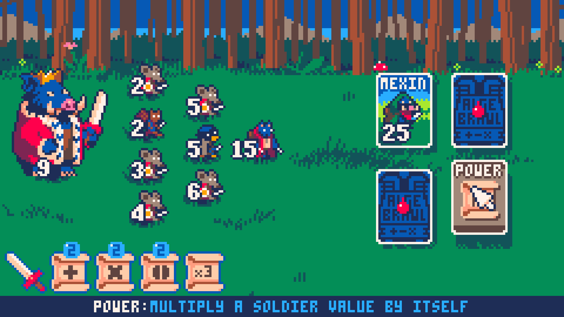 Super Algebrawl is a byte-sized tactics puzzle RPG where you control a boar king with magical mathematical powers! The king can add up and multiply his animal underlings to match whatever enemy opposes him! He is on a quest for glory, slaying the horrible monsters that plague the animal realm, and recruiting valiant heroes to add up to his numbers.