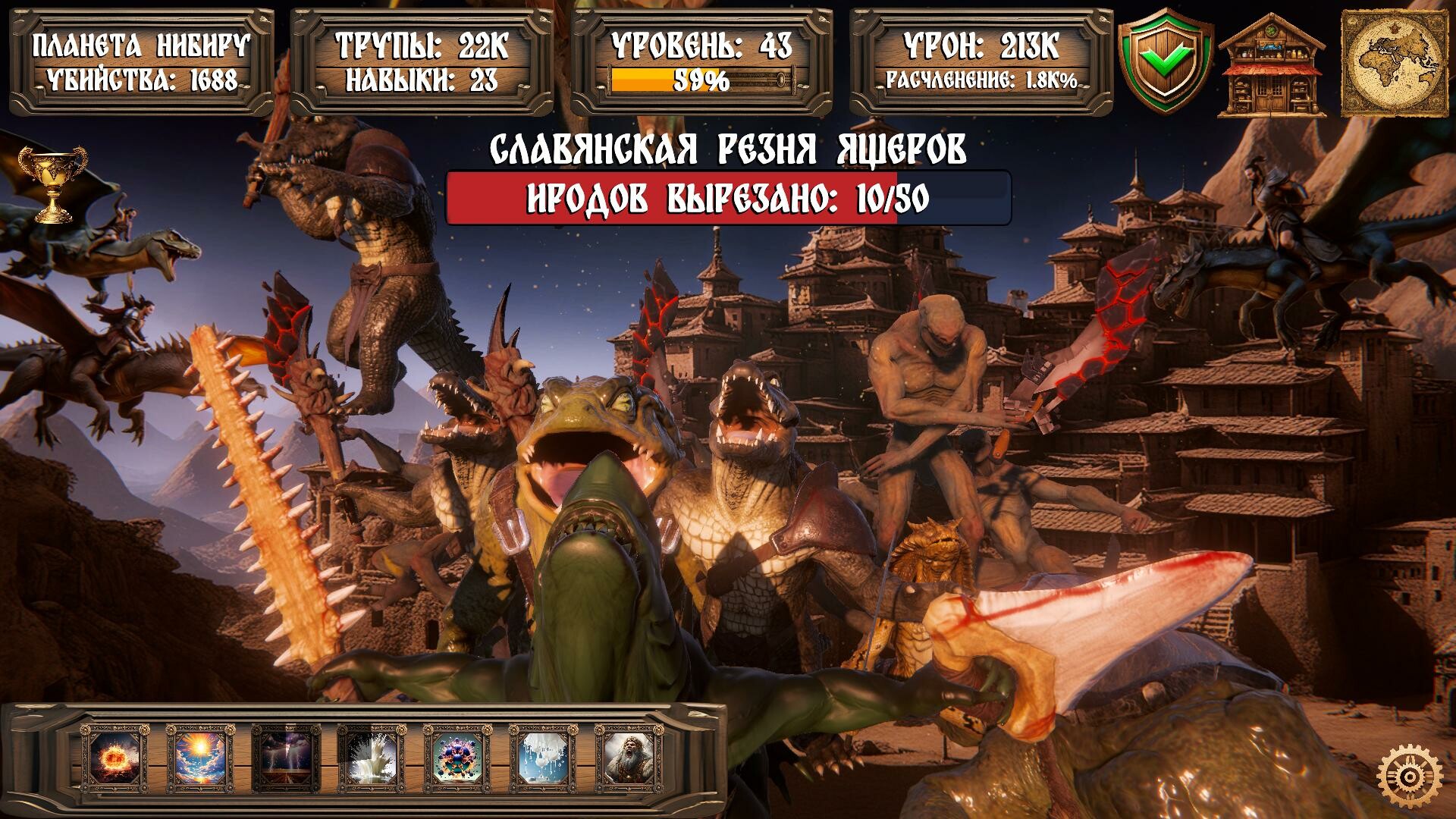Убивай ящеров во имя богов и жертвуй их тела, в обмен на благословения! Почувствуй силу водицы байкальской, наполнись мощью молний Перуна, получи как минимум 4 древнеславянских образования, приручи союзников древних русов - динозавров и не только