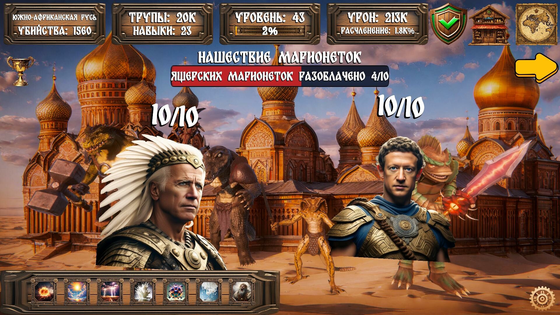 Величайшие подвиги древних русов во времена первой русо-ящерской войны перенесены в эту игру, чтобы каждый рус мог поучаствовать в этих великих сражениях! Вырезай ящеров под Байкальском, прорви великий славянский котел под Тывой, защити великий торговый путь в ЮАР (Южно-Африканскую Русь), победи ящеров в Пеледуйском побоище и во многих других знаковых для нашего народа битвах