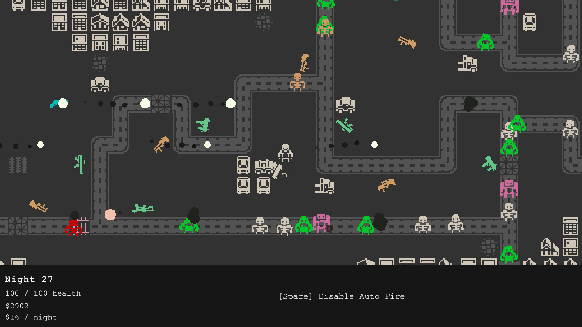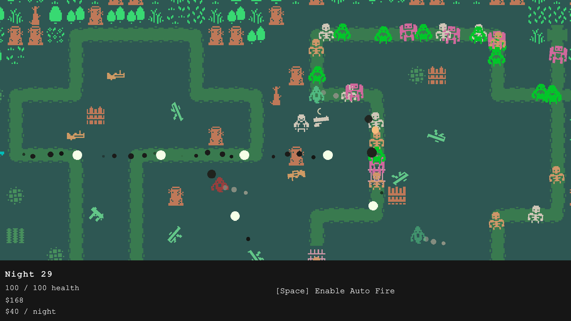 Bullet heaven meets tower defense! Control a character with an upgradeable gun, and place turrets in the map to defend yourself! Be strategic about how to spend money and what upgrades you choose for your character in order to survive the night.