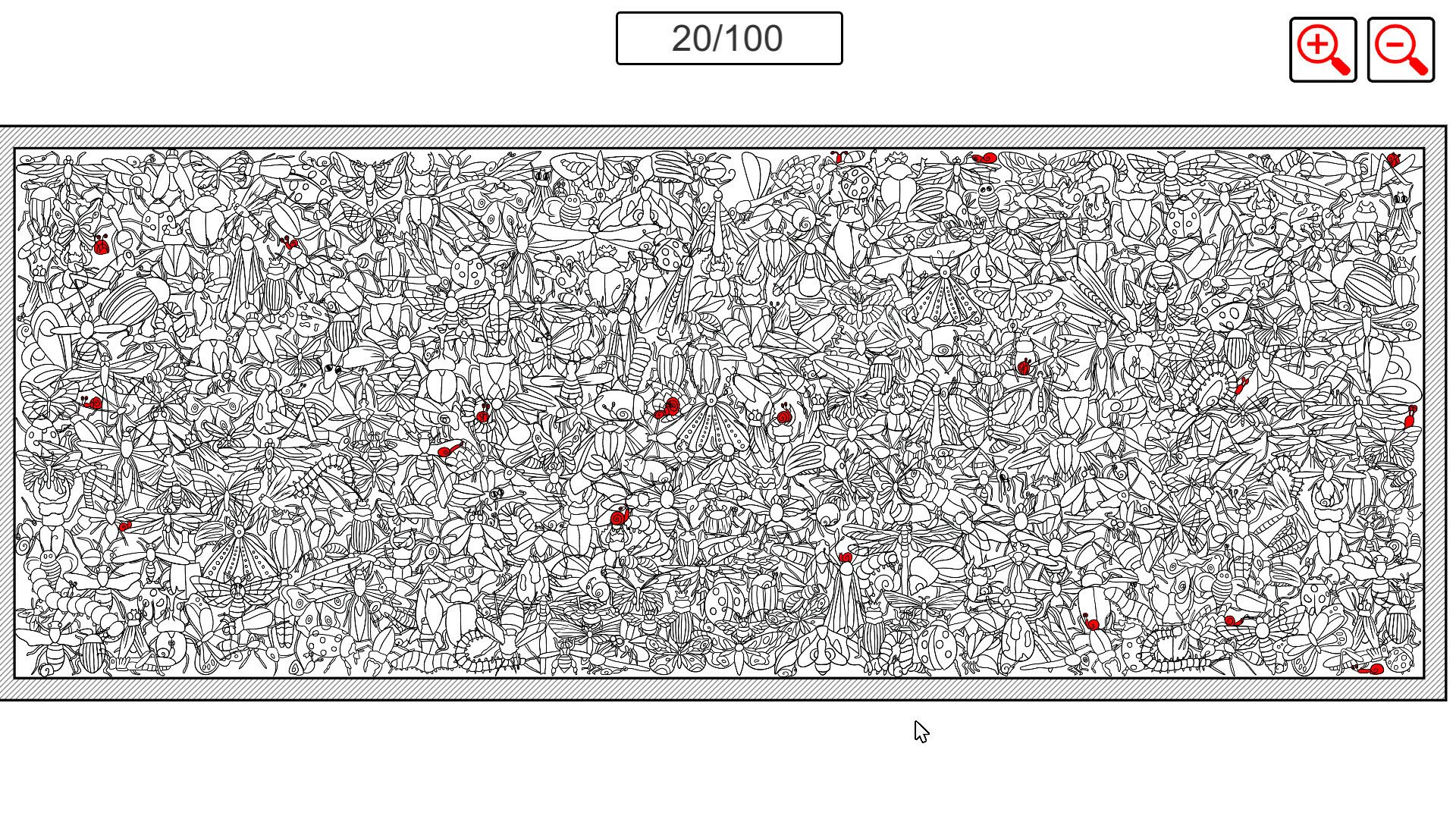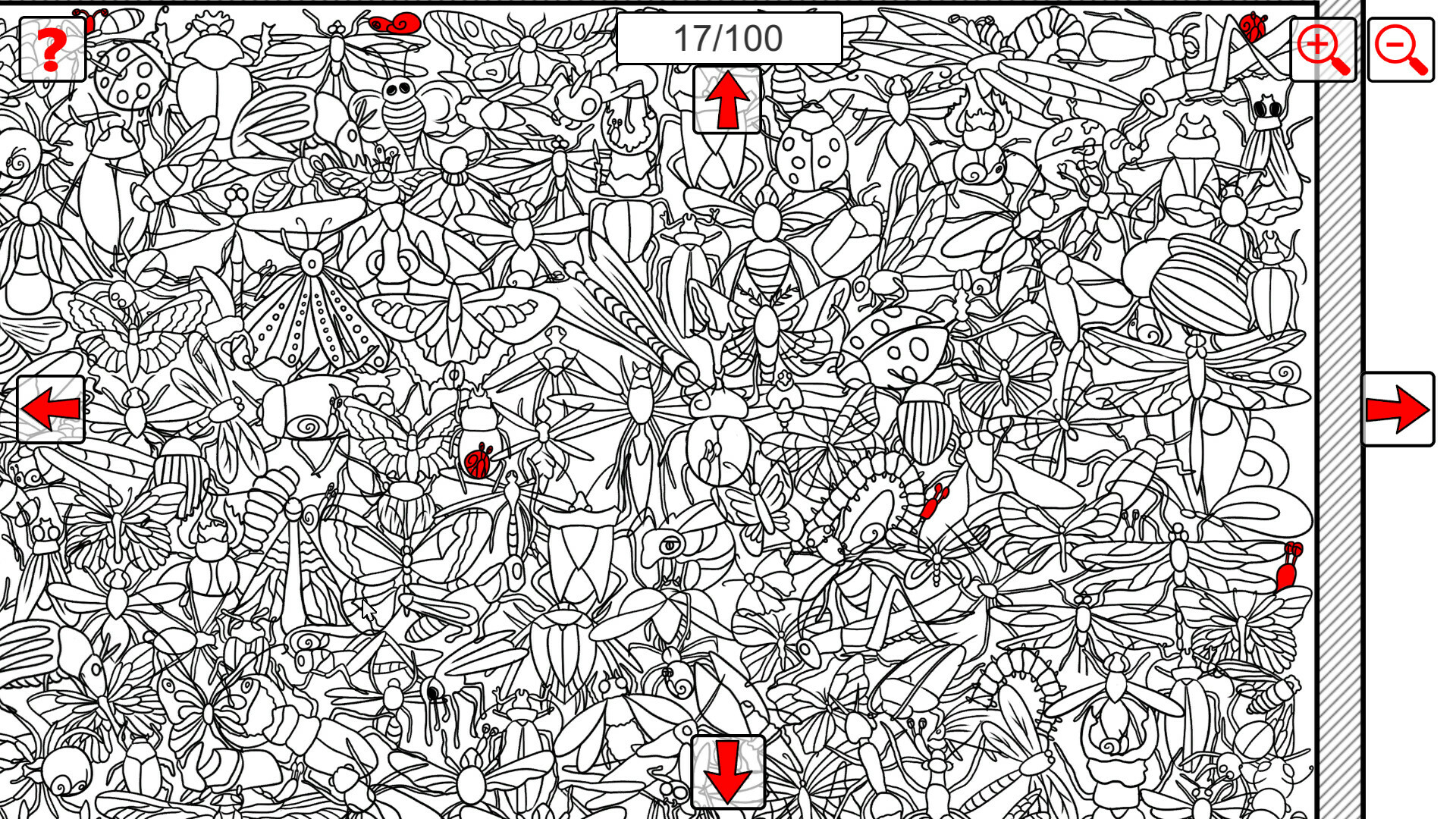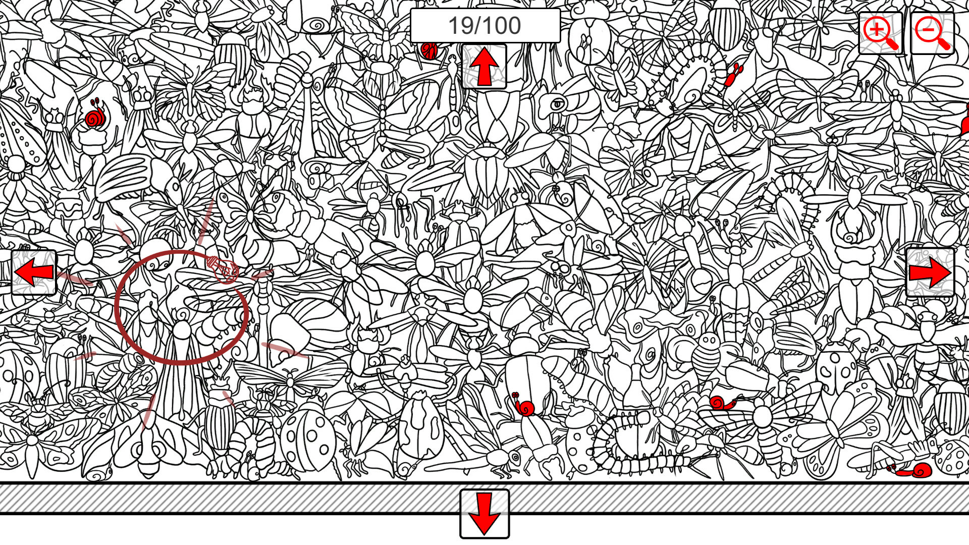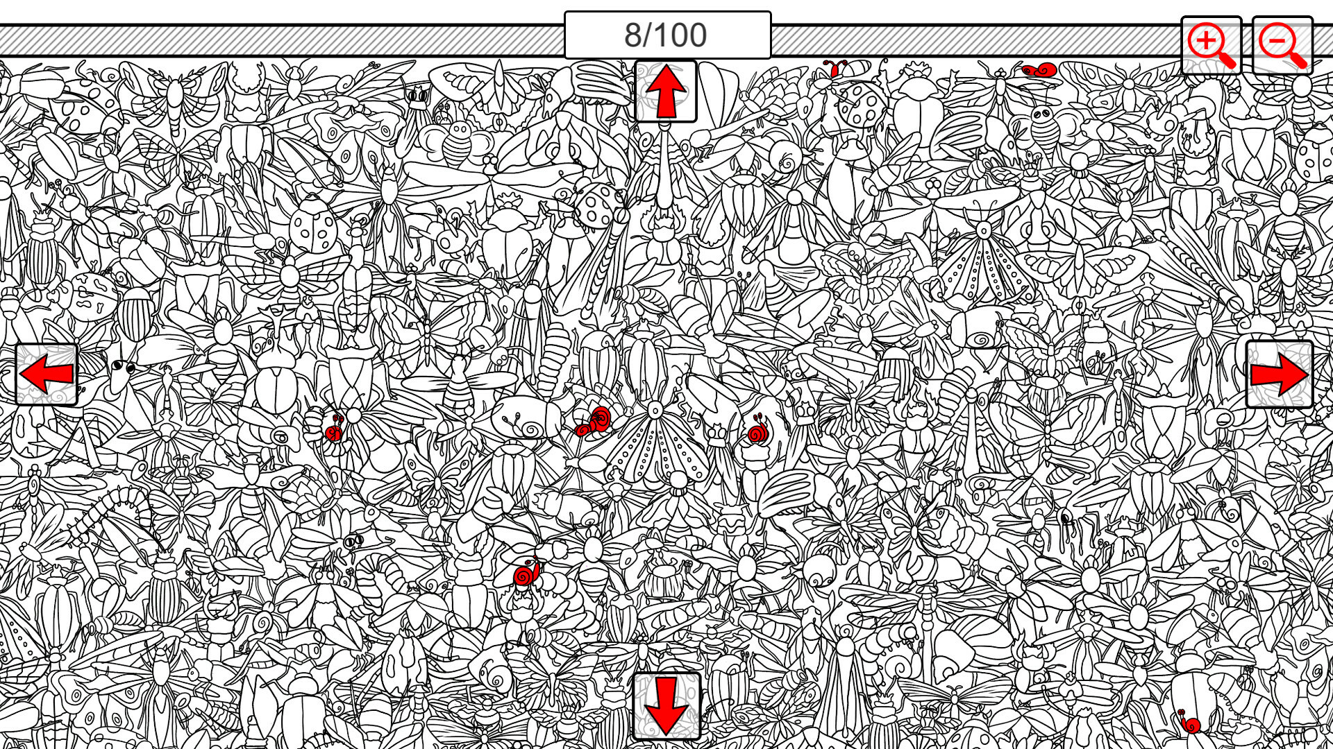 Отправляется на поиск улиток, спрятавшихся в куче разнообразных насекомых. Они различаются по размерам и некоторые очень-очень маленькие, поэтому может пригодиться функция приближения изображения и подсказки.