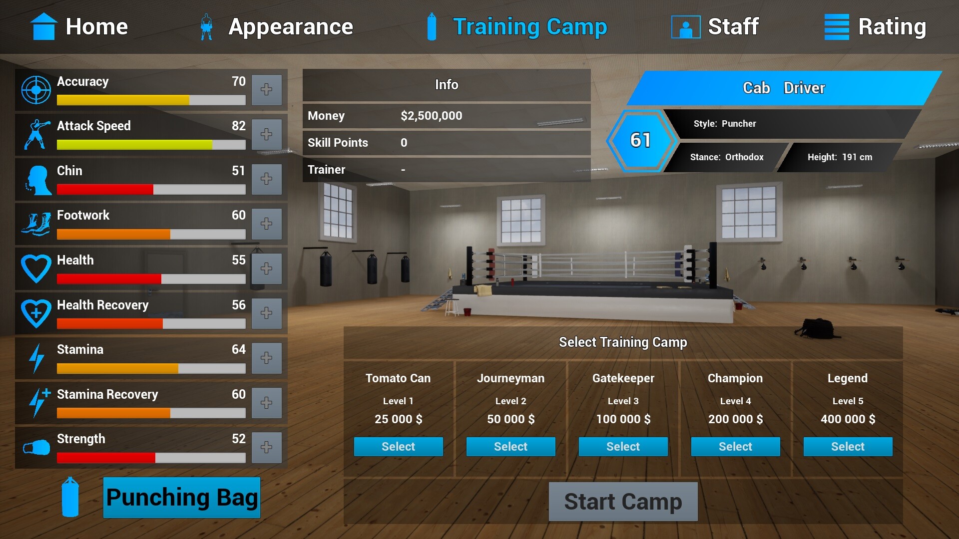 - 9 skills (strength, accuracy, health, stamina, footwork, attack speed, chin, HP and SP recovery)