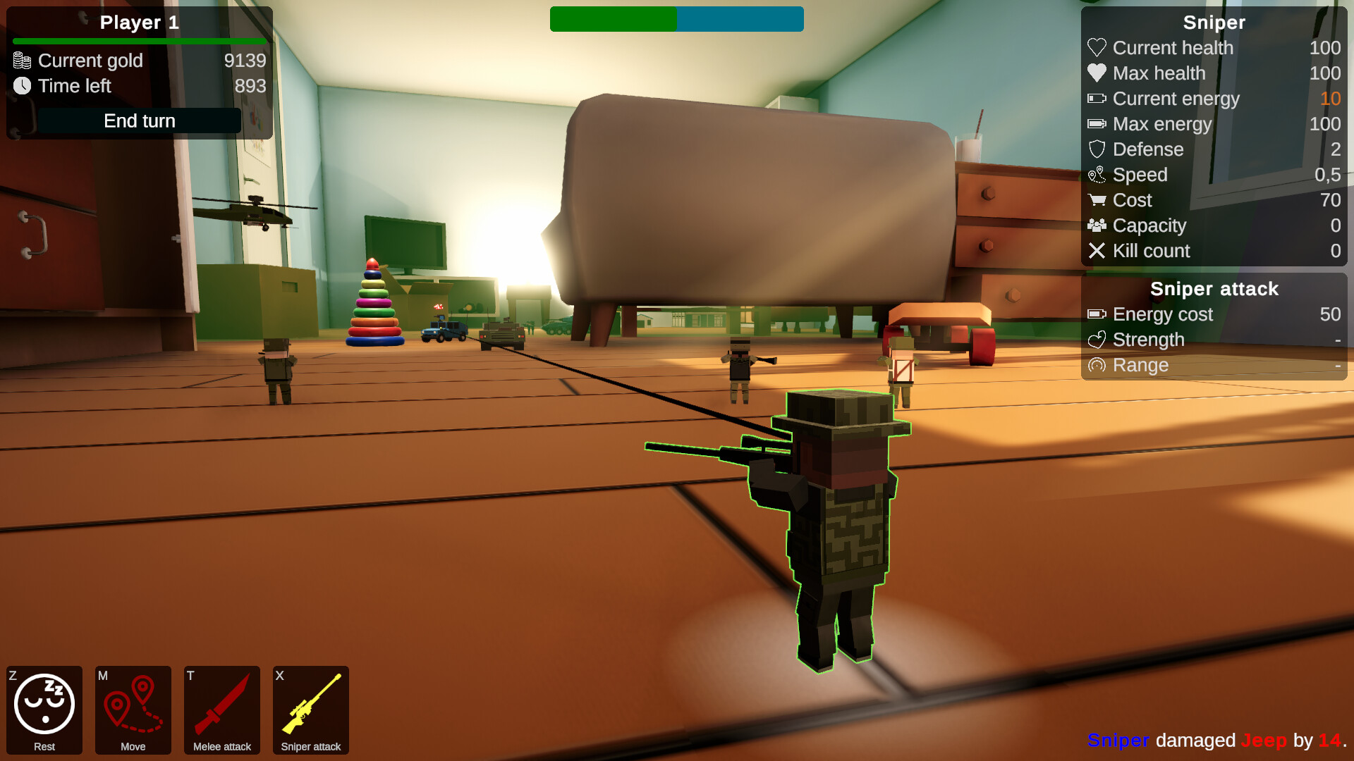 Используй стратегию и изобретательность, чтобы преодолеть врагов, используя уникальную местность каждой комнаты. Будь то укрытие за стопкой книг или игрушечный замок как наблюдательный пункт - в этой хитрой стратегической игре каждый ход имеет значение.