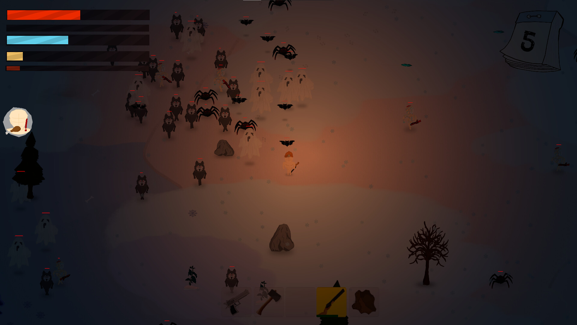 During the day - you are the most happy carefree young naked man, chopping trees and picking berries looking for his friends. But night time comes and you become a real hitman and feel like Vampire Survivors pro-gamer dodging flying rocks from space and mega men from the dungeons. 12 mines out of crates in angras out of 10.