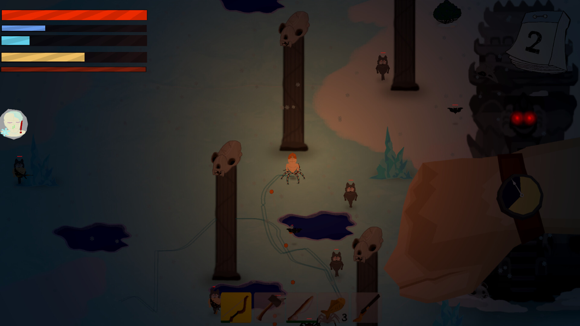 С наступлением темноты открывается настоящая опасность. Ночь — это время, когда холод кусается сильнее всего, и появляются ночные существа, привлеченные вашим присутствием. Бой становится неизбежным, поскольку вы отбиваетесь от этих угроз, используя любые средства, которые вы создали или нашли в течение дня. Цикл день-ночь — ваш постоянный спутник и противник, диктующий ваши действия и стратегии. Дневной свет — ваш союзник в исследовании и собирательстве, но с наступлением ночи выживание становится вашей единственной целью.