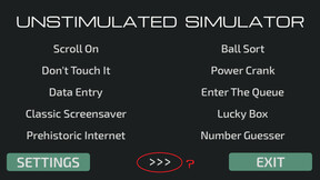 Unstimulated Simulator is a collection of 20 ‘minigames’ that turn mundane and anticlimactic tasks into a mundane and anticlimactic gaming experience. 10 are initially available. Find and complete the secret game to unlock the other 10.