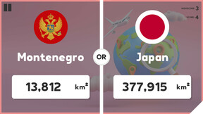 Игра "Какая страна больше?" - это быстрая и увлекательная географическая игра, в которой вам предстоит сравнить две страны и выбрать ту, площадь которой больше. Проверьте свои знания о мире, откройте для себя удивительные различия в размерах и отточите навыки работы с картой с помощью быстрых и веселых сопоставлений.