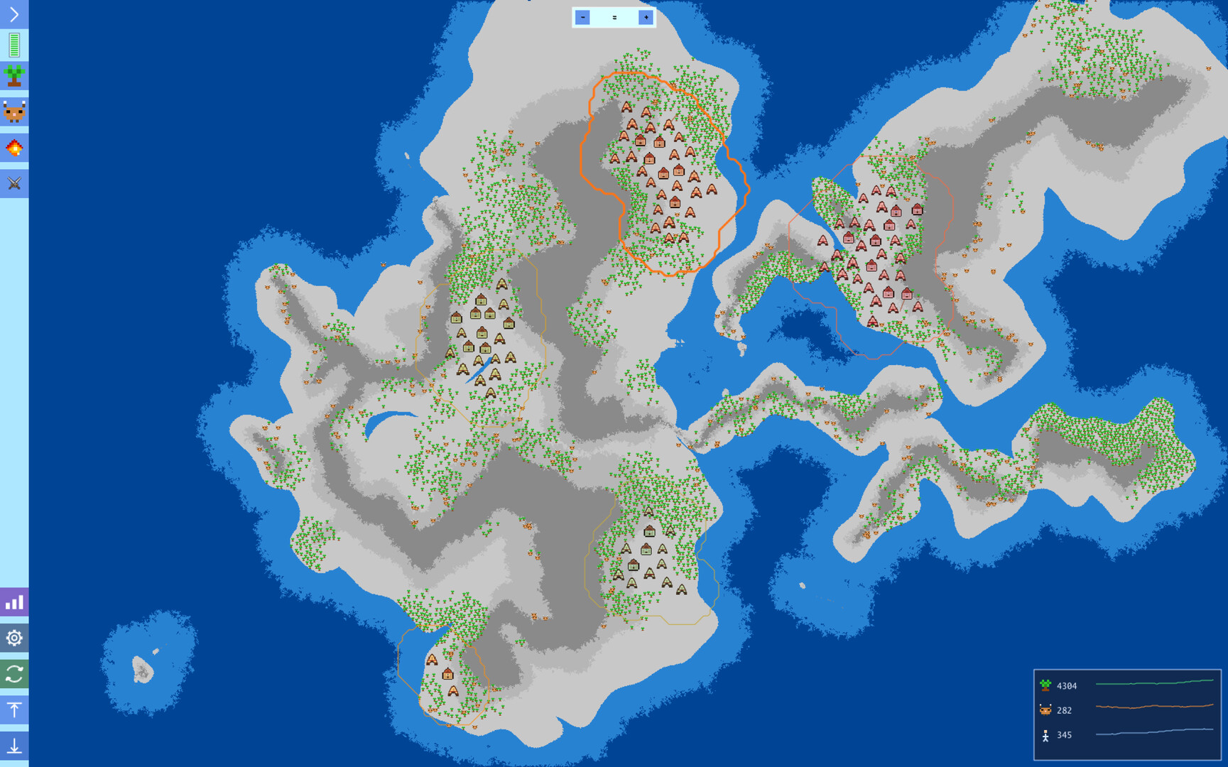Игра держится на балансе: ресурсы, рост населения, конфликты между племенами, стихийные события (засуха, эпидемии) и постоянный выбор между развитием и агрессией. Вы можете менять скорость симуляции, сохранять/загружать партии и наблюдать статистику в реальном времени.