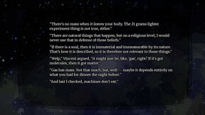 Quantum Coffee Conundrum is a kinetic visual novel focused on immersive sound and atmosphere, offering a dark comedy and reverent pastiche to the Golden Age of Philosophical Science Fiction, in an attempt to blend the industrial cynicism of Harlan Ellison to the Absurdist conflict of Albert Camus and the reality-warping paranoia of Philip K. Dick.