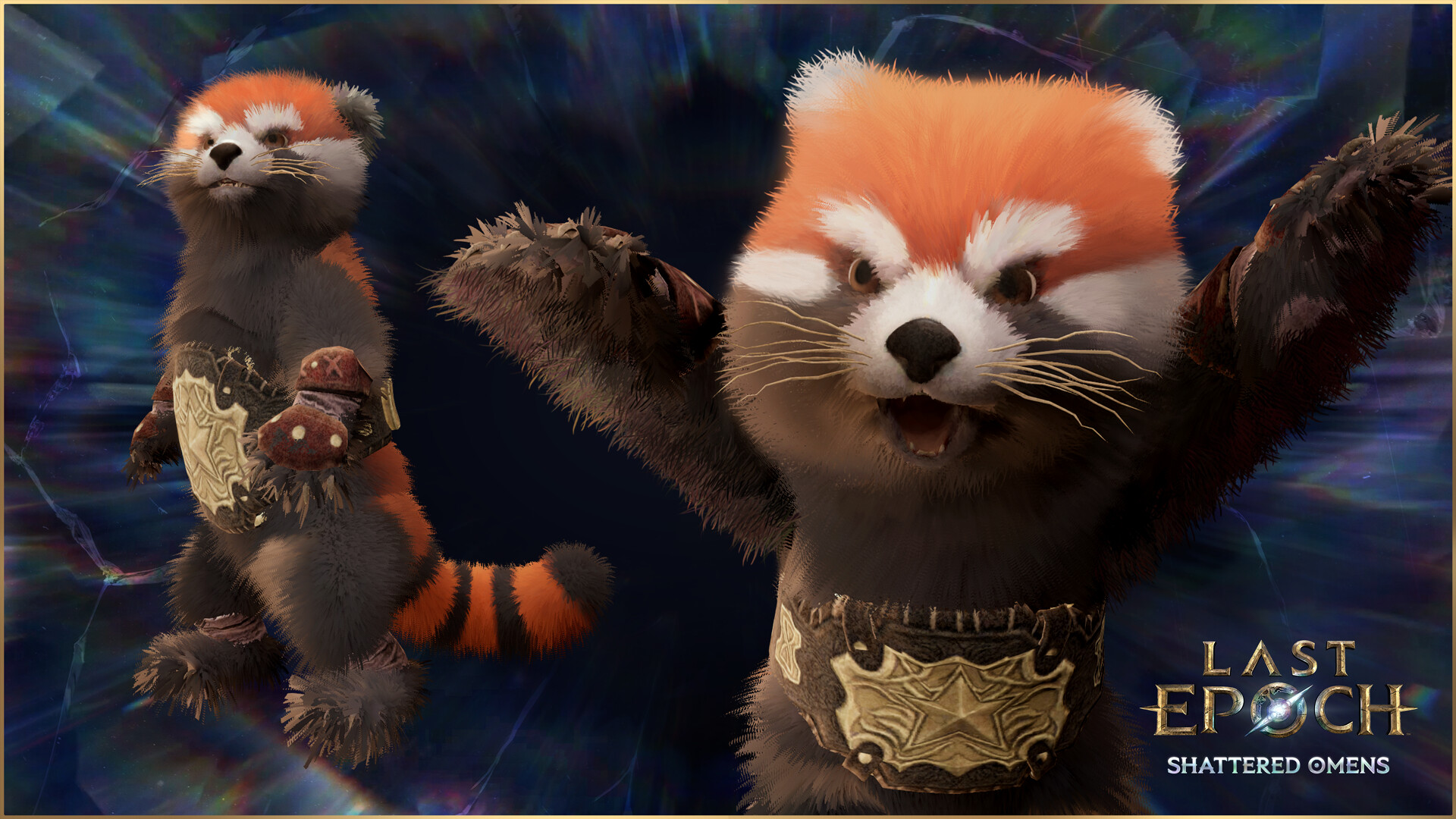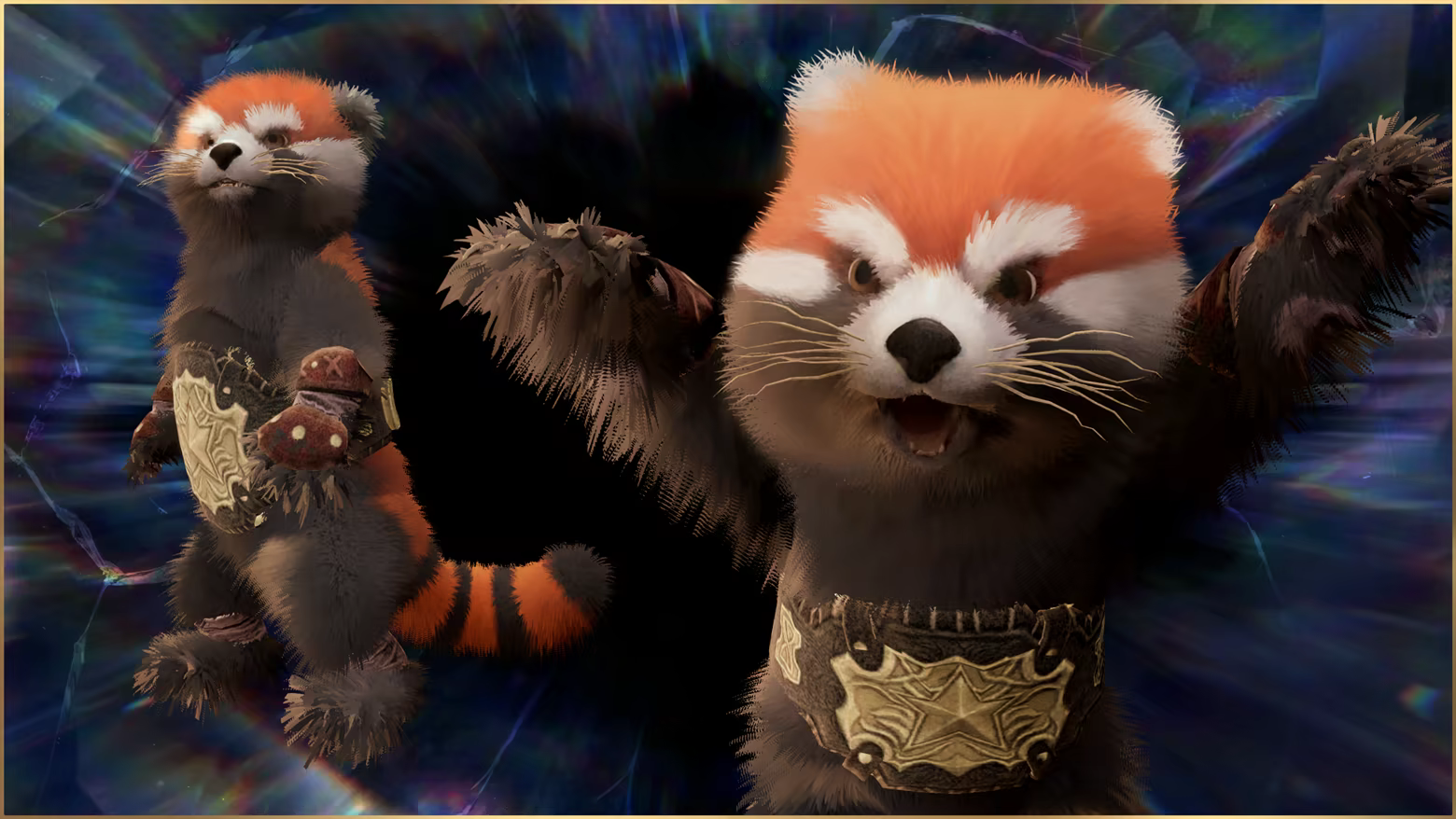 Живой и энергичный зверек из неведомых земель — красная панда с замотанными лапками и чемпионским поясом. Этот малыш всегда готов отпраздновать ваши победы, высоко подняв лапки рядом с вами.