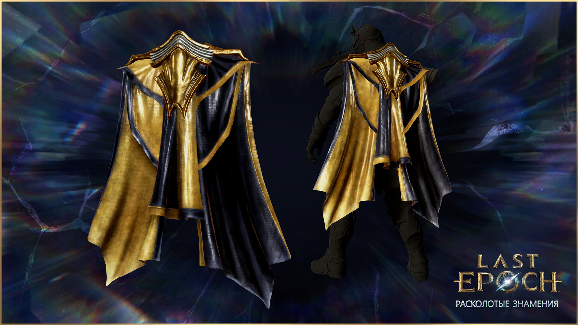 Величественный аксессуар для спины, который облачает вашего персонажа в многослойную ткань, обрамленную сияющим воротником, напоминающим затмение, где свет и тень сливаются вдоль струящегося подола.