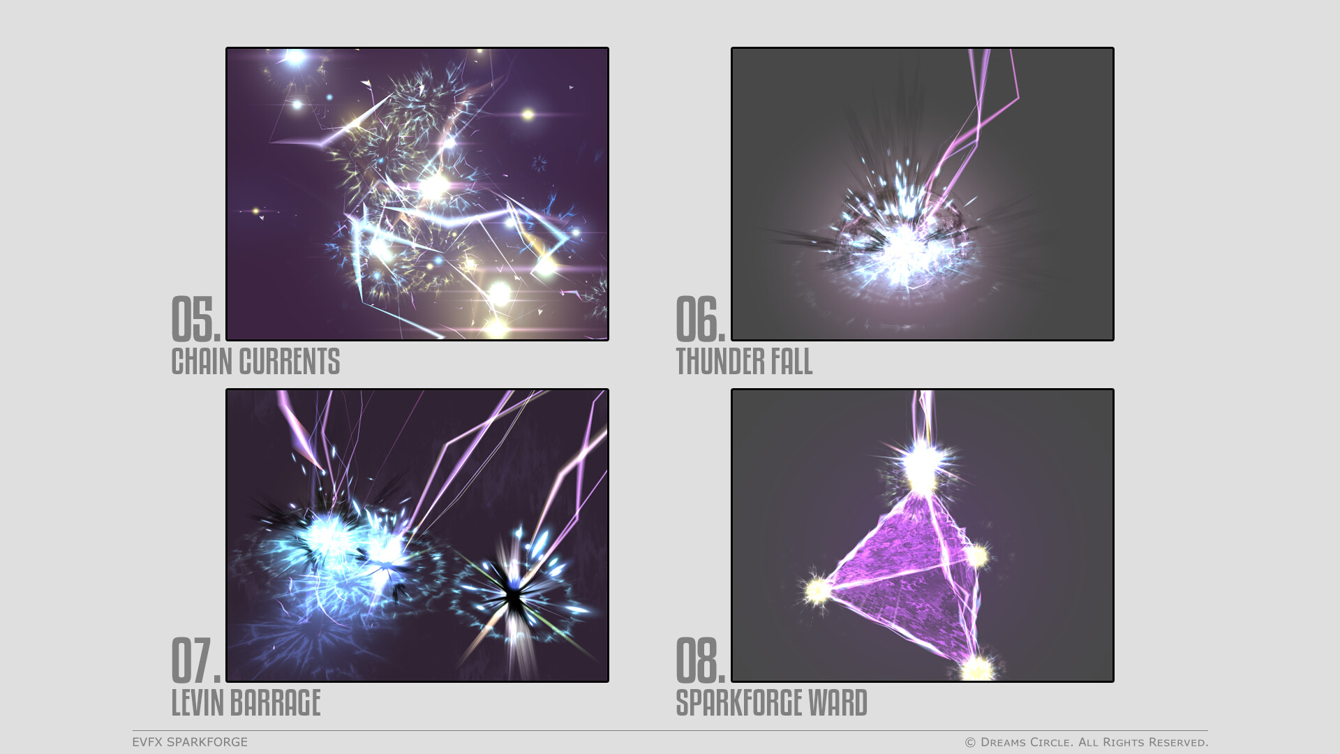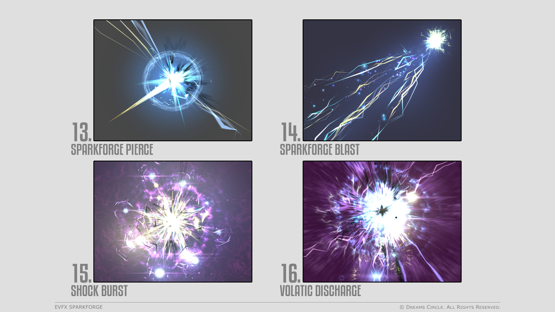 Designed by Dreams Circle, a team specializing in high-quality game assets, "EVFX Sparkforge" features 16 gorgeous visual effects AND complementary sound effects, allowing you to add that professional polish to your projects easier than ever before and awe your audience!
