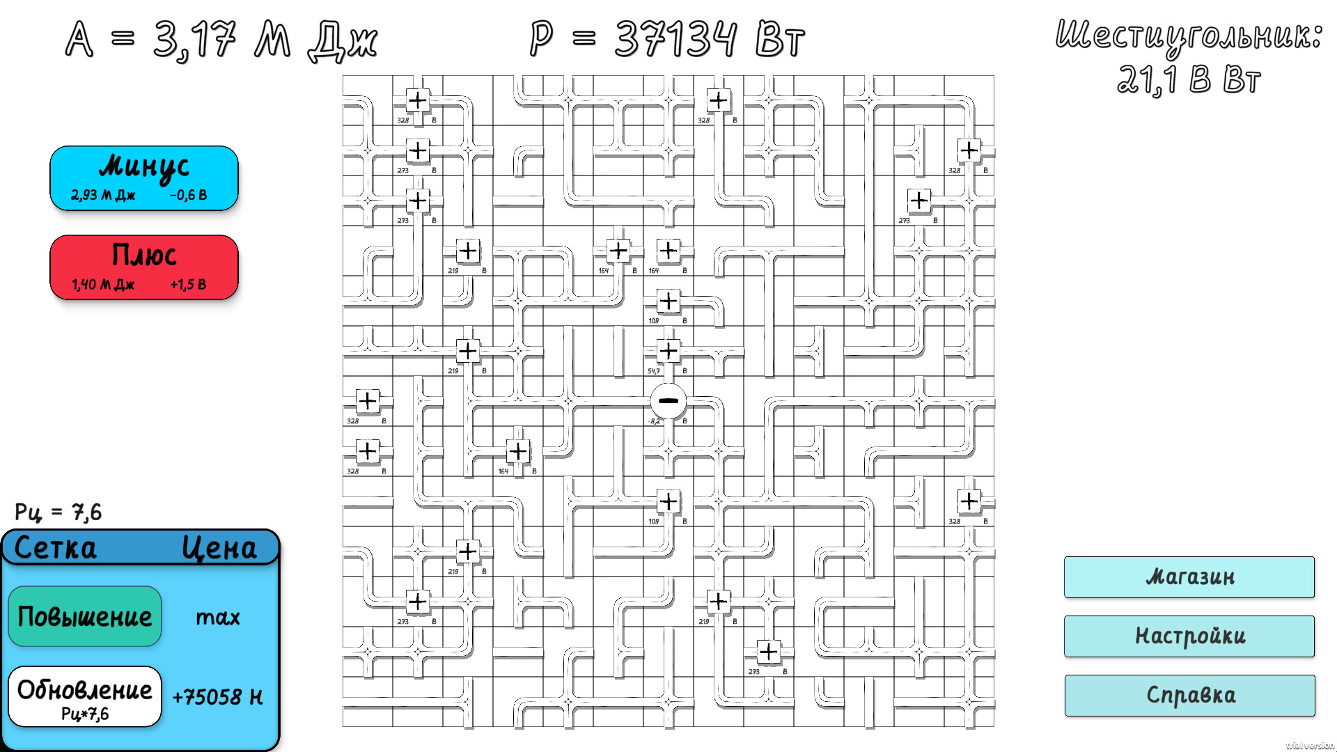 Idle-головоломка в стиле электрических цепей. Меняйте положение проводов, чтобы увеличить доход. Вам нужно будет соединять плюсы с минусом, и в целом различные клетки, наиболее правильным способом, чтобы зарабатывать как можно больше. Вас ожидает обычная квадратная сетка, шестиугольная и восьмиугольная. Покупайте улучшения в магазине, чтобы развить свою цепь.