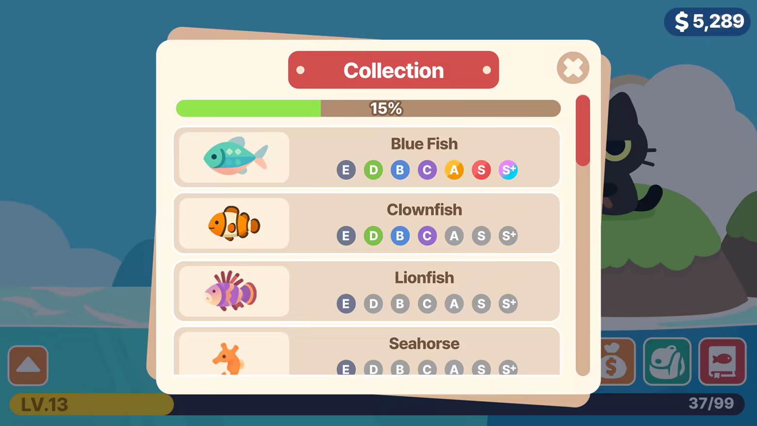 Collect fish to fill up the cat’s encyclopedia, earn money, and dress it up in adorable outfits!