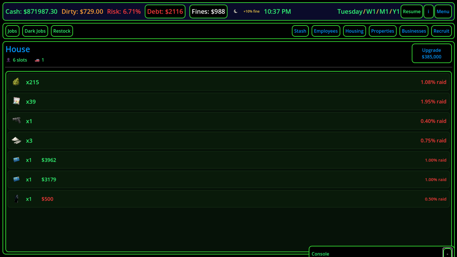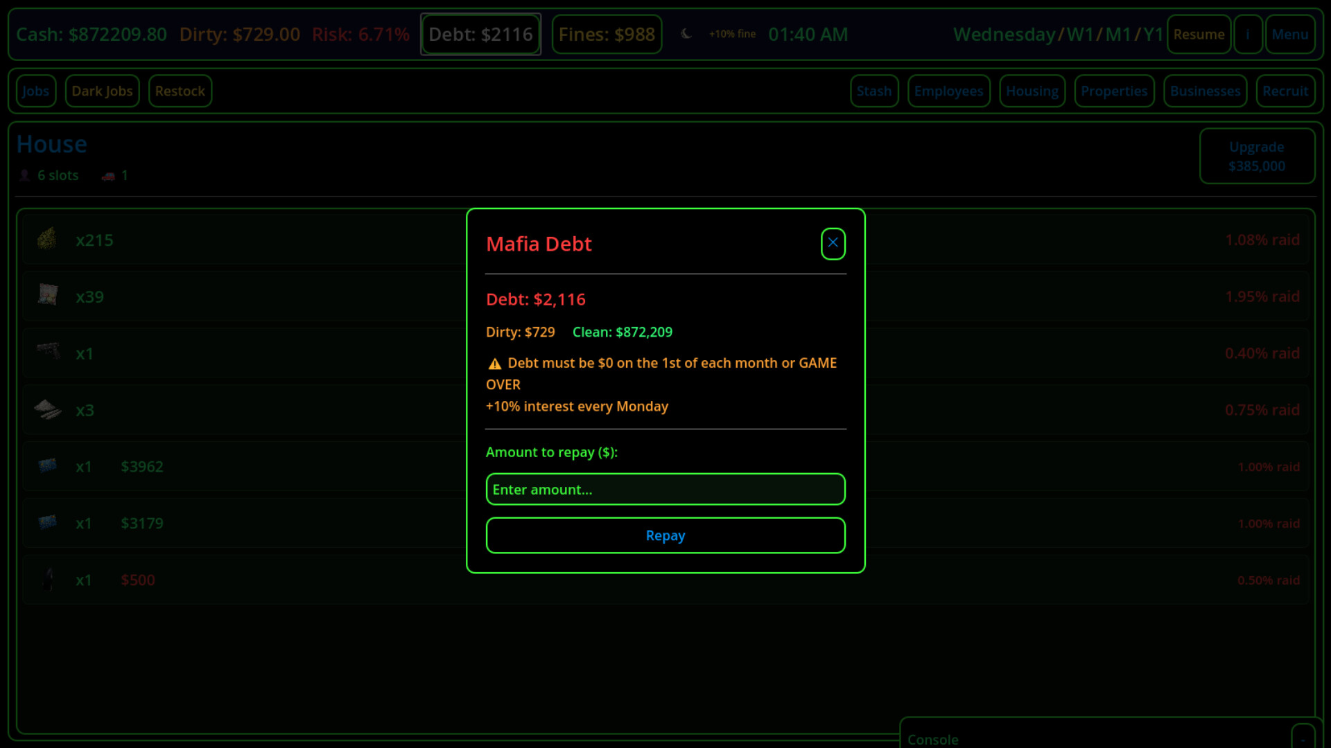 You play as a small-time hustler trying to rise through the criminal underworld. Manage your stash, grow your network of employees, and turn dirty money into a legitimate empire — all while staying one step ahead of the law.