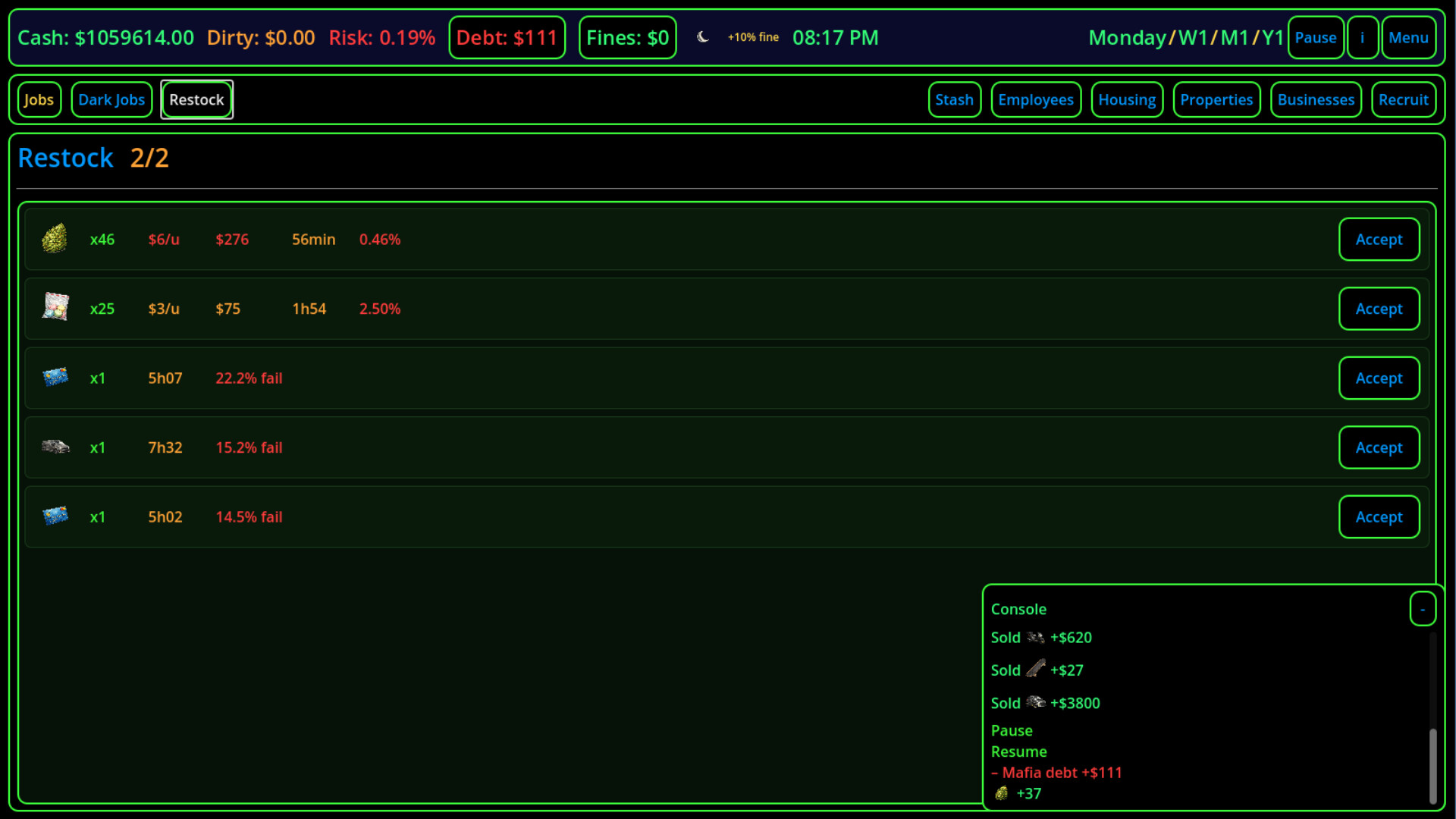Every decision matters. Buy too much product and your raid risk spikes. Miss a mafia debt payment and it's game over. Hire the right employees and watch your operation scale.