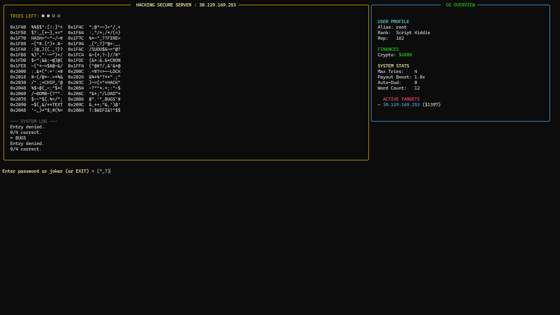 Step into the shadows. Terminal Hacker: Override is an infinite, procedurally generated hacking simulator. Accept dark web contracts, bypass firewalls using pure word-deduction logic, and upgrade your system. No hand-holding, just you, the terminal, and the next target.