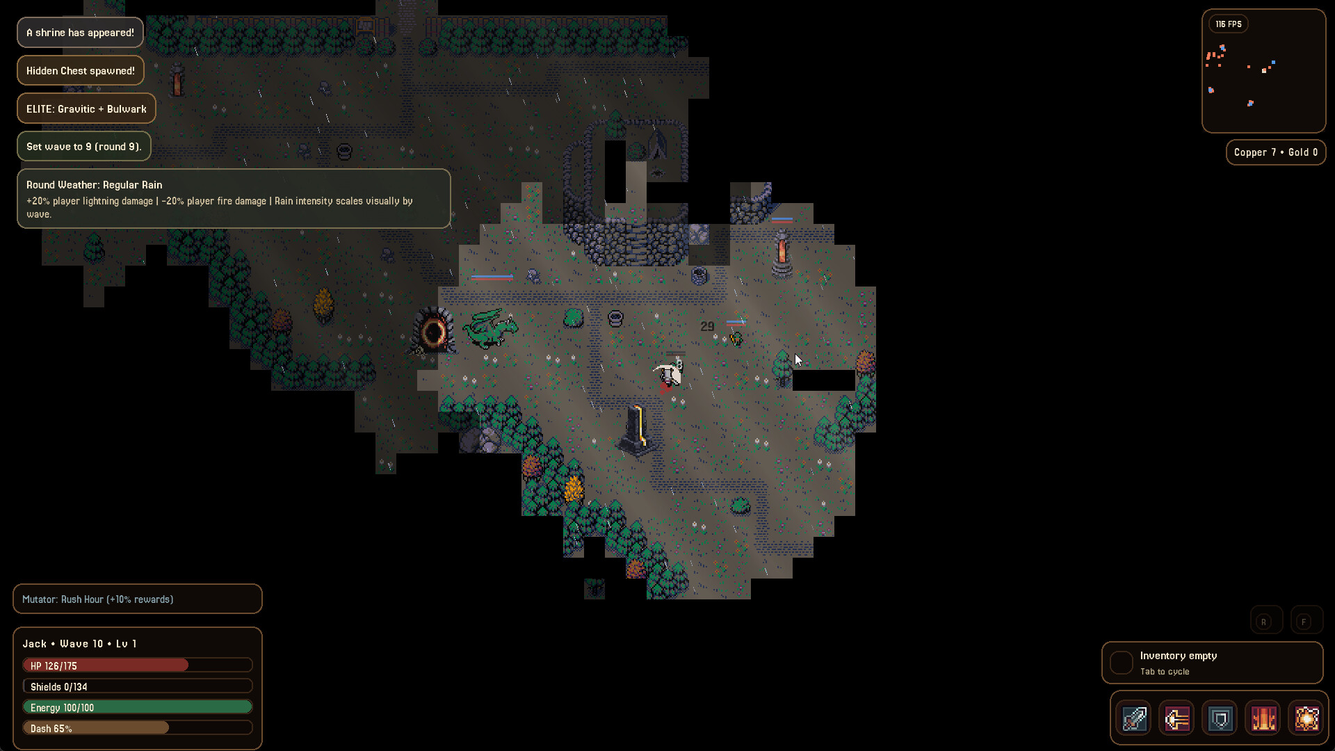 Depending on your starting difficulty, your starting Round might change, normally you will start at Round 1, Wave 1. Defeating each wave will reward you will experience, and copper. Enemies themselves will occasionally drop from a large pool of items or potentially drop some helpful or even risky powerups! Each Wave has the potential for a random Mutator that will apply one of many modifiers to that Wave. Monsters themselves can also spawn as Elite variants with powerful Affixes.