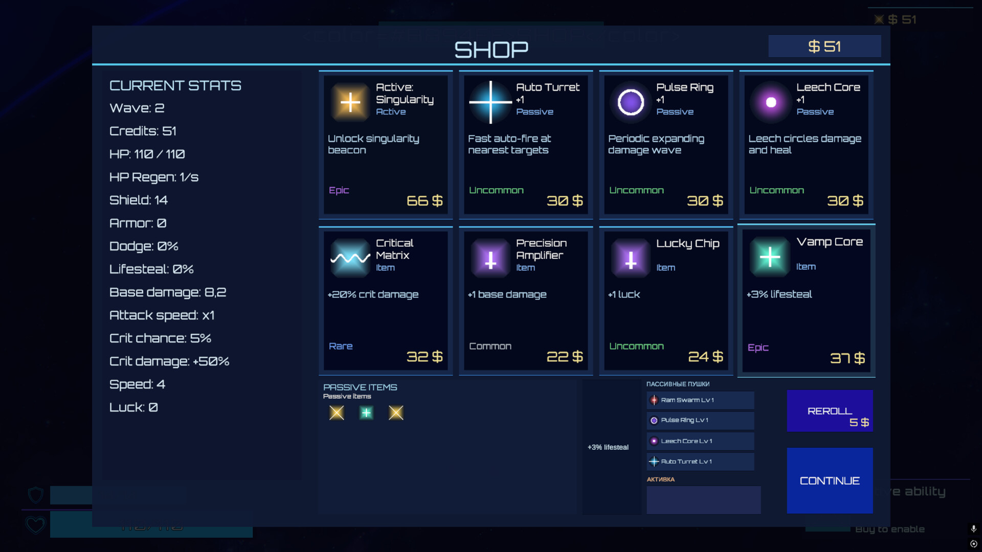 Roguelite-прогрессия в рамках забега: волны, магазин, усиления, риск