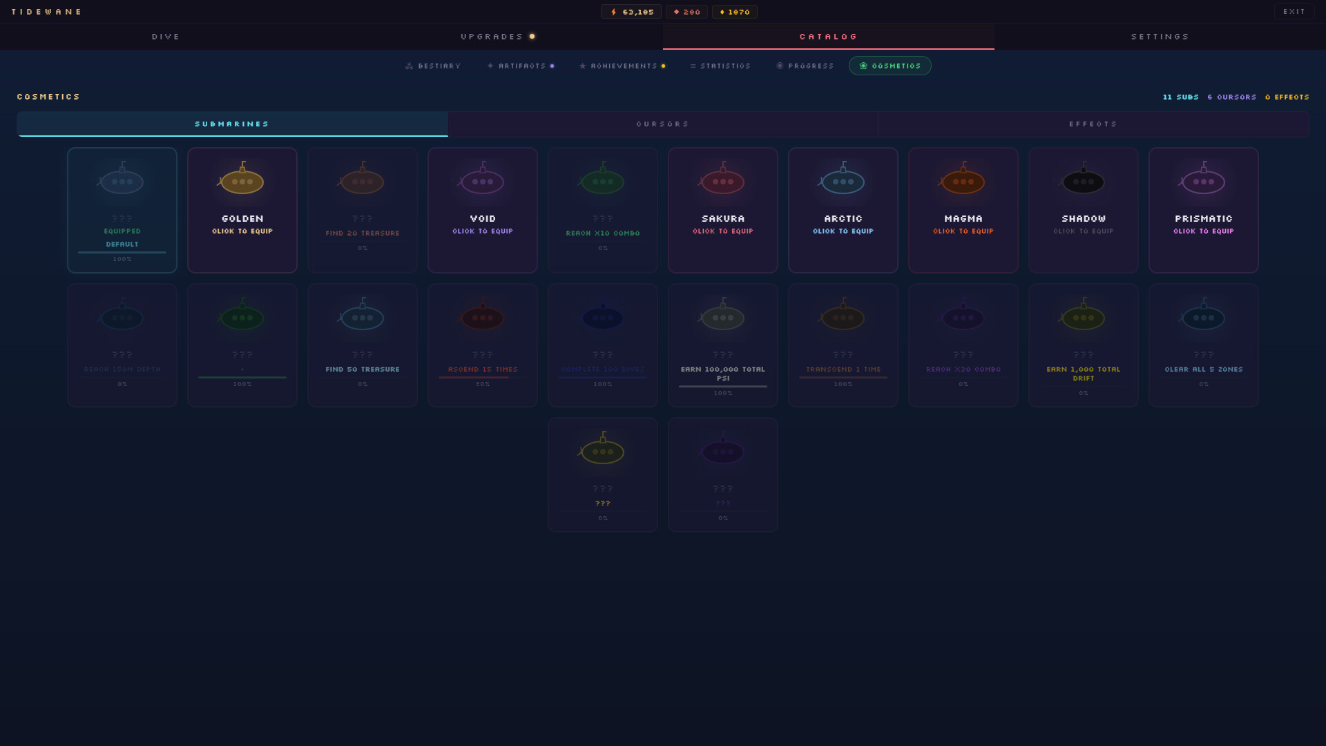 Unlock 20 submarine skins and 16 cursor designs. Each sub has a unique look rendered in pixel art style.
