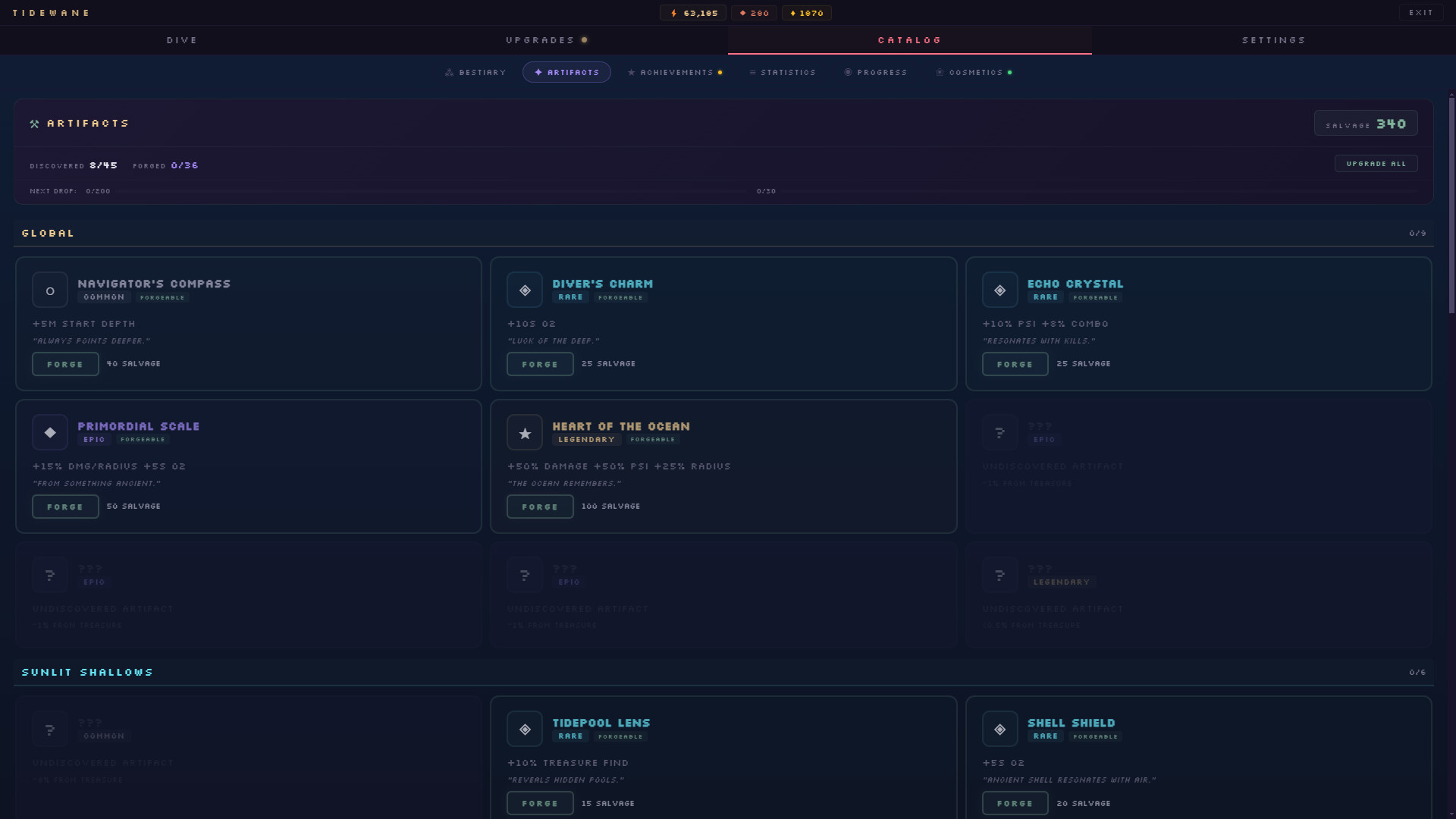 Discover 36 artifacts with unique effects. Forge them to higher levels using salvage from Deep Dive mode. Complete the bestiary documenting every creature you've encountered.
